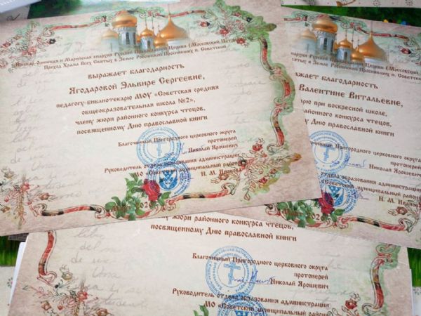 Выступления участников конкурса оценивало жюри в составе: Кошкина Валентина Витальевна – библиотекарь воскресной школы храма Всех святых в земле Российской просиявших; Ягодарова Эльвира Сергеева – педагог-библиотекарь Советской средней общеобразовательной школы №2 и Маркова Эмилия Яковлевна – учитель начальных классов средней общеобразовательной школы №3 п. Советский.