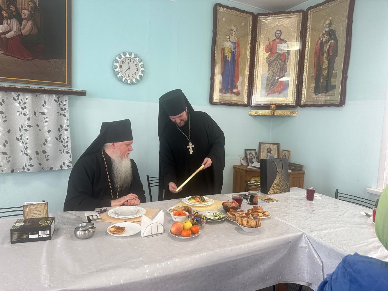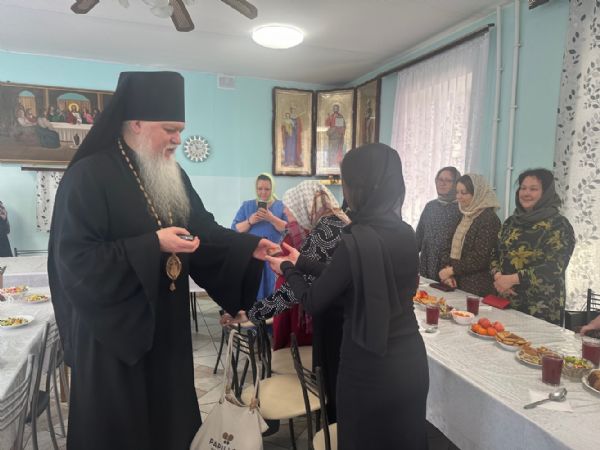 После молебна в трапезной собора состоялась встреча с владыкой Феофаном, в которой приняли участие представители социального отдела епархии, слушатели Школы сестёр милосердия, председатели местных отделений Всероссийских обществ слепых, глухих и инвалидов. Архипастырь поздравил присутствующих с днём памяти обретения мощей святителя Луки, пожелал Божией помощи в несении труда во благо ближних, подарил каждому иконки Божией Матери «Семистрельная» с благословением на дальнейшие труды.