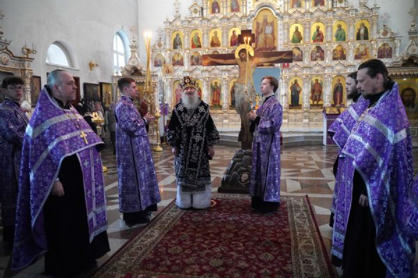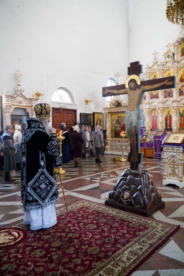 В центре храма митрополит Иоанн читал 18 и 19 главы из Евангелия от Иоанна о страданиях и крестной смерти Господа нашего Иисуса Христа. После чего обратился к собравшимся с проповедью о смирении и страданиях Пречистой Богородицы, стоящей у Креста Господня. Она, распинаясь материнским сердцем со Своим Сладчайшим Сыном, молилась вместе с Ним за распинателей. Ей Спаситель в лице Своего возлюбленного ученика апостола Иоанна Богослова усыновил все человечество.