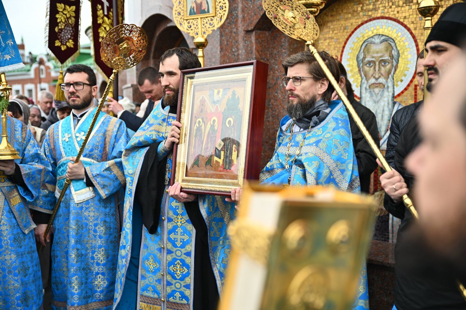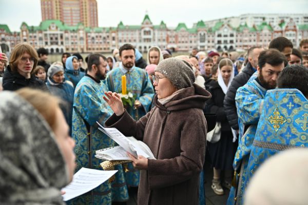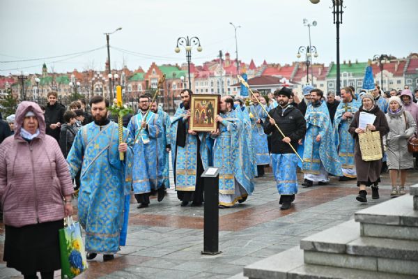 После Литургии в ознаменование престольного праздника состоялся крестный ход вокруг храма с чтением Евангелия и кроплением святой водой. По традиции, священство и миряне подошли к скульптурной композиции «Пресвятая Богородица с Младенцем Христом». Здесь верующие вознесли соборную молитву Покровительнице нашего края.