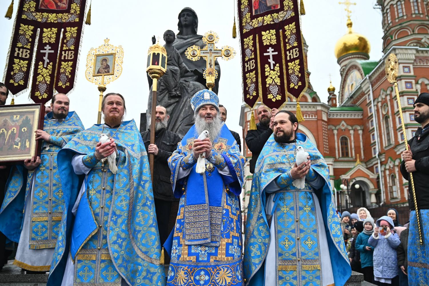 Под пение величания Деве Марии «Архангельский глас…» митрополит Иоанн, протоиерей Сергий Поглазов и иерей Никифор Захаров выпустили в небо белых голубей.