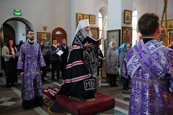 На великом повечерии в центре храма митрополит Иоанн читал трипеснец, посвященный событиям евангельских зачал, читаемых на службах Страстных Понедельника и Вторника.