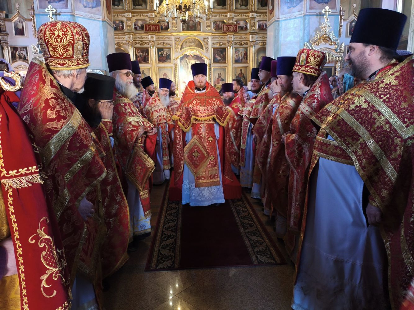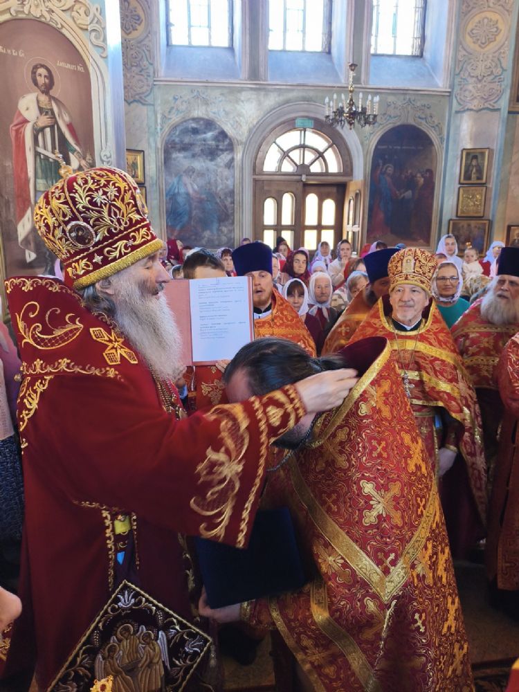 На входе с Евангелием митрополит Иоанн вручил богослужебно-иерархические награды: настоятель Михаило-Архангельского храма п. Юрино протоиерей Николай Барсуков удостоен права служения Божественной литургии с отверстыми царскими вратами по «Отче наш…», настоятель Троицкого храма г. Козьмодемьянска протоиерей Алексий Сущев и настоятель Преображенского храма с. Кожваши протоиерей Николай Соколов – права ношения наперсного креста с украшениями; настоятель Петропавловского храма с. Кузнецово иерей Алексей Семенов – права ношения палицы; настоятель храма Рождества Христова с. Еласы иерей Александр Сиситкин – права ношения наперсного креста золотого цвета; настоятель храма Рождества Пресвятой Богородицы с. Сумки иерей Сергий Иванов и настоятель Тихвинского храма г. Козьмодемьянска иерей Феодор Ромашов – права ношения камилавки.