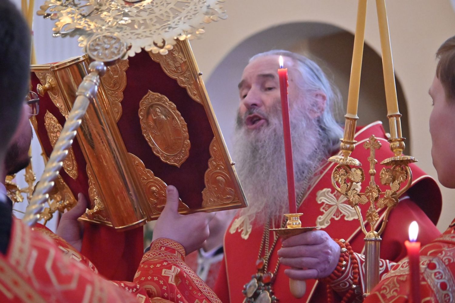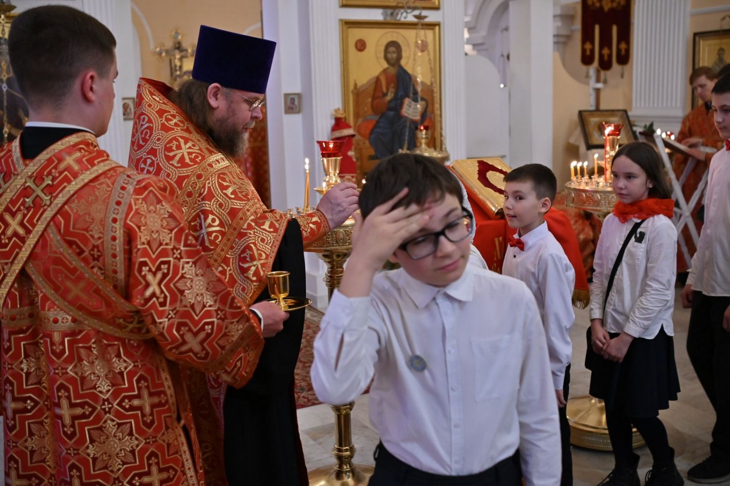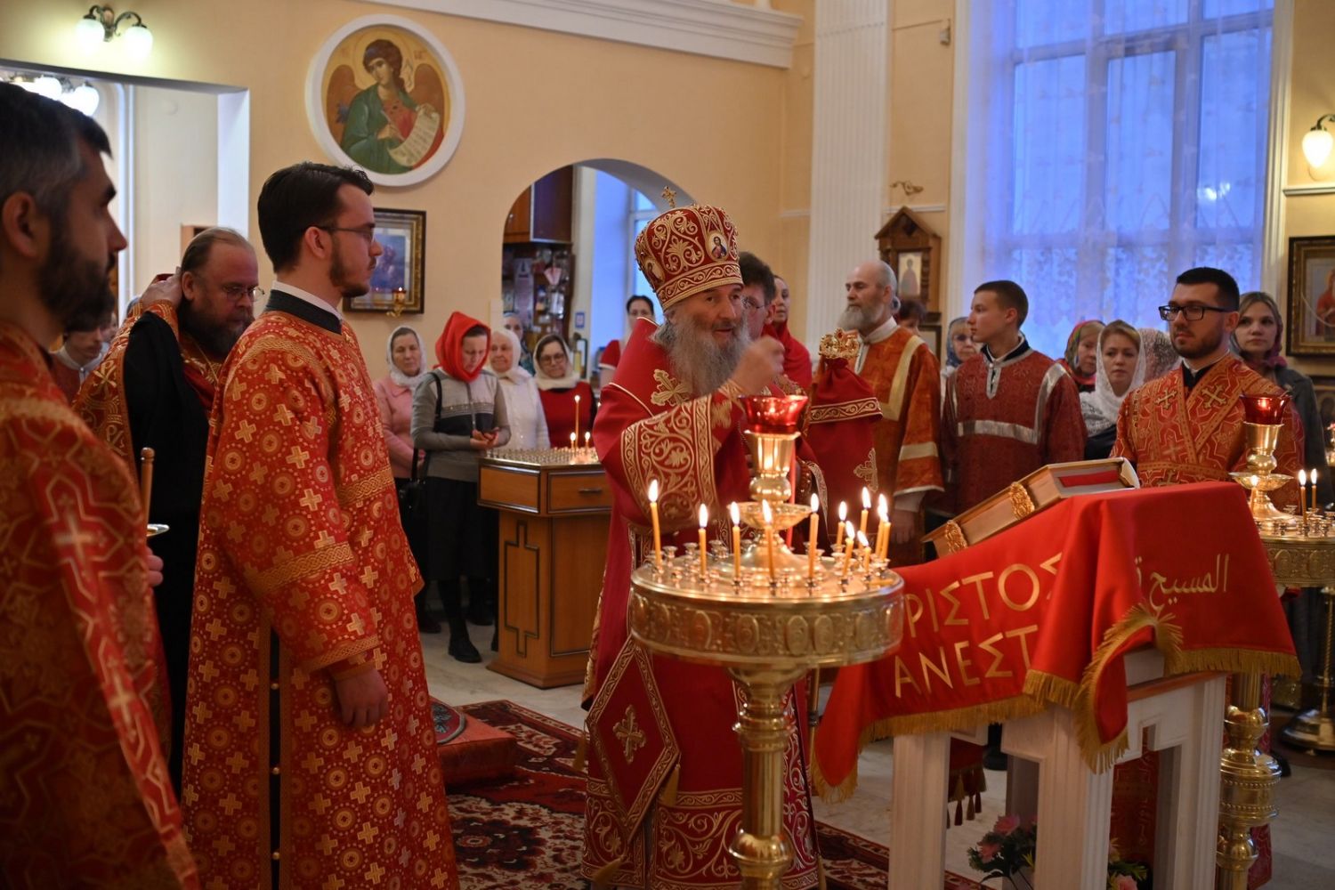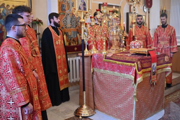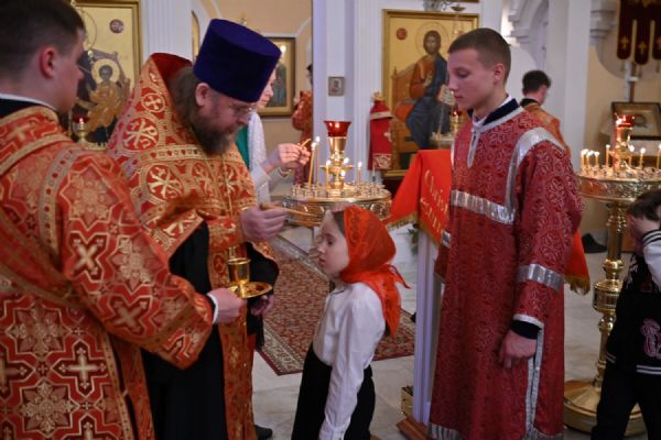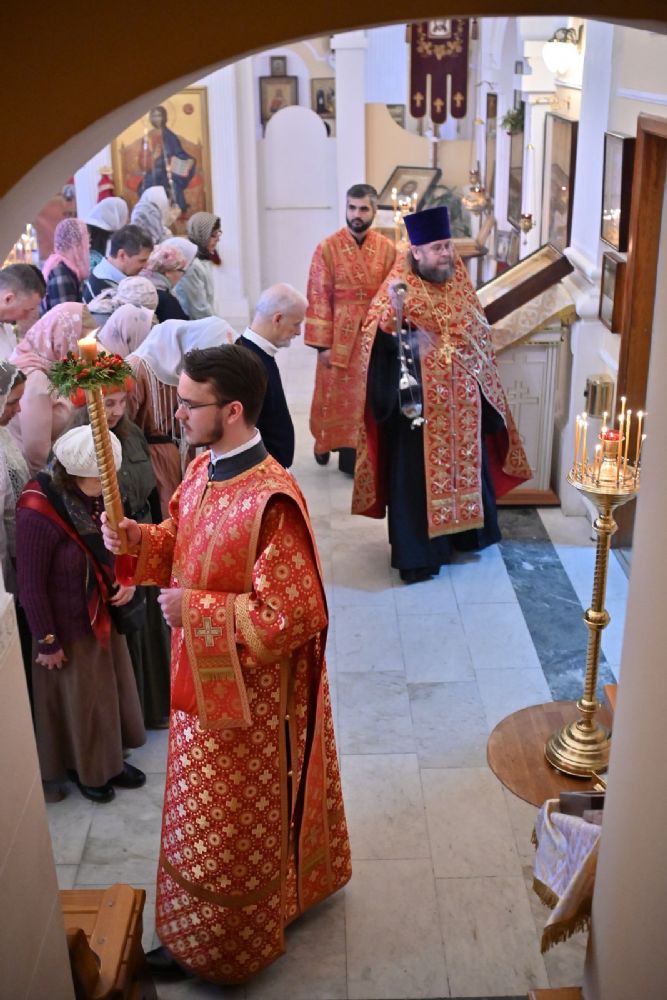 Архипастырю сослужили настоятель храма протоиерей Евгений Сурков, клирики храма иерей Андрей Иванов и диакон Никита Сурков. Песнопения исполняли хор храма под управлением Аллы Симаковой и детский хор гимназии имени Сергия Радонежского.