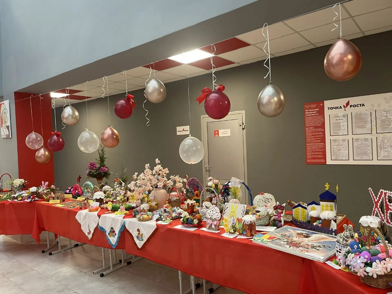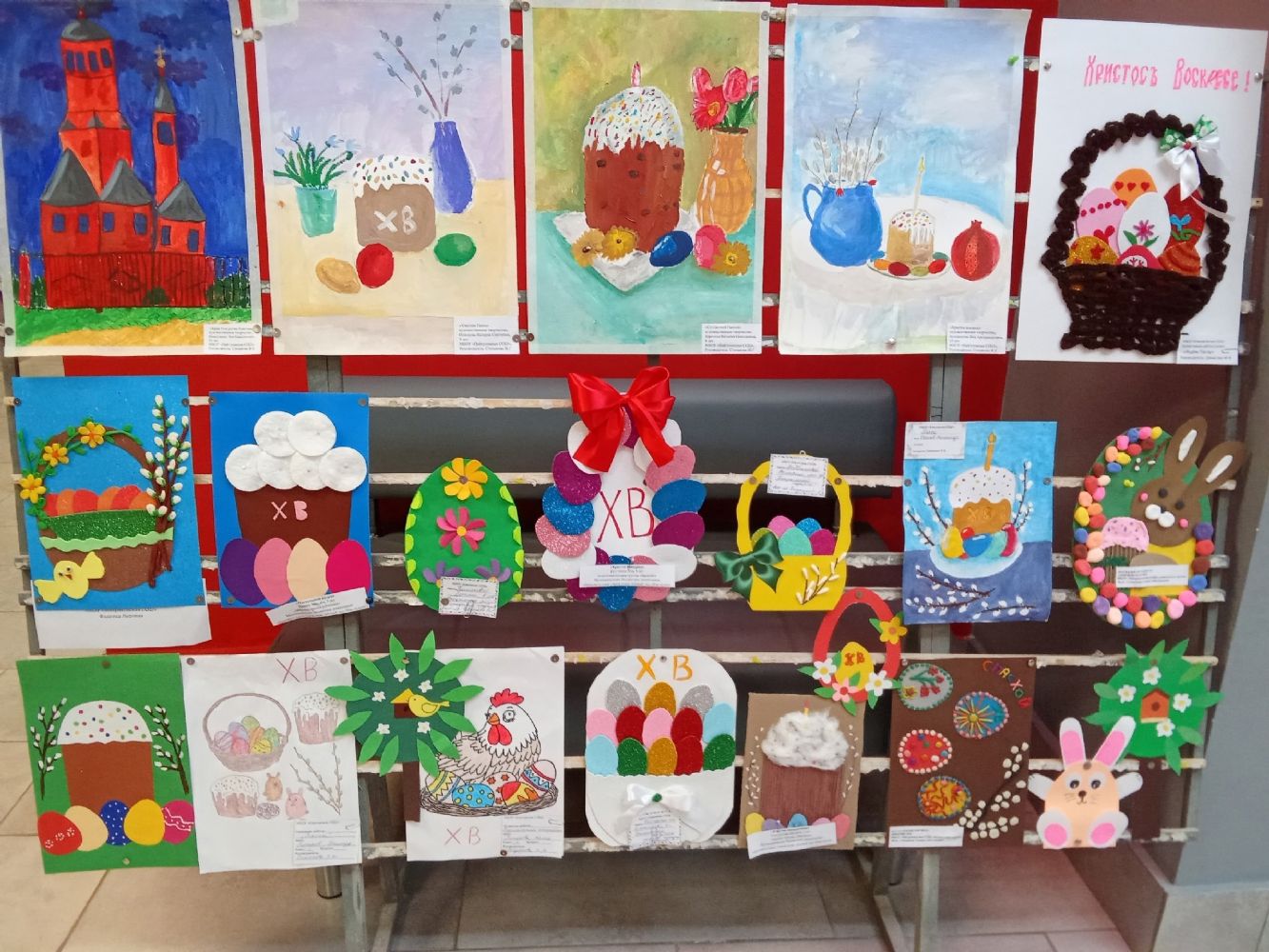 В фойе школы была представлена экспозиция поделок на пасхальную тему –расписные яйца (в техниках декупаж, бисероплетение, роспись), пасхальные венки, игрушки и сувениры, а также рисунки, аппликации и открытки с изображением праздничных атрибутов.