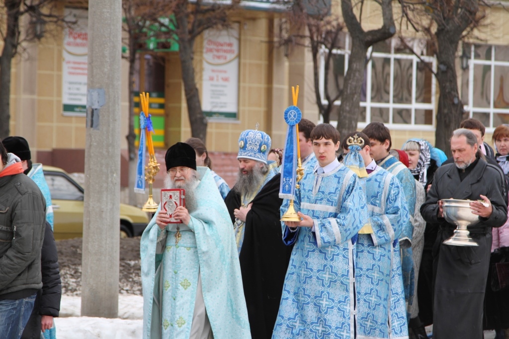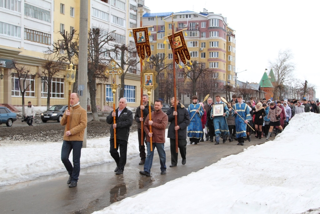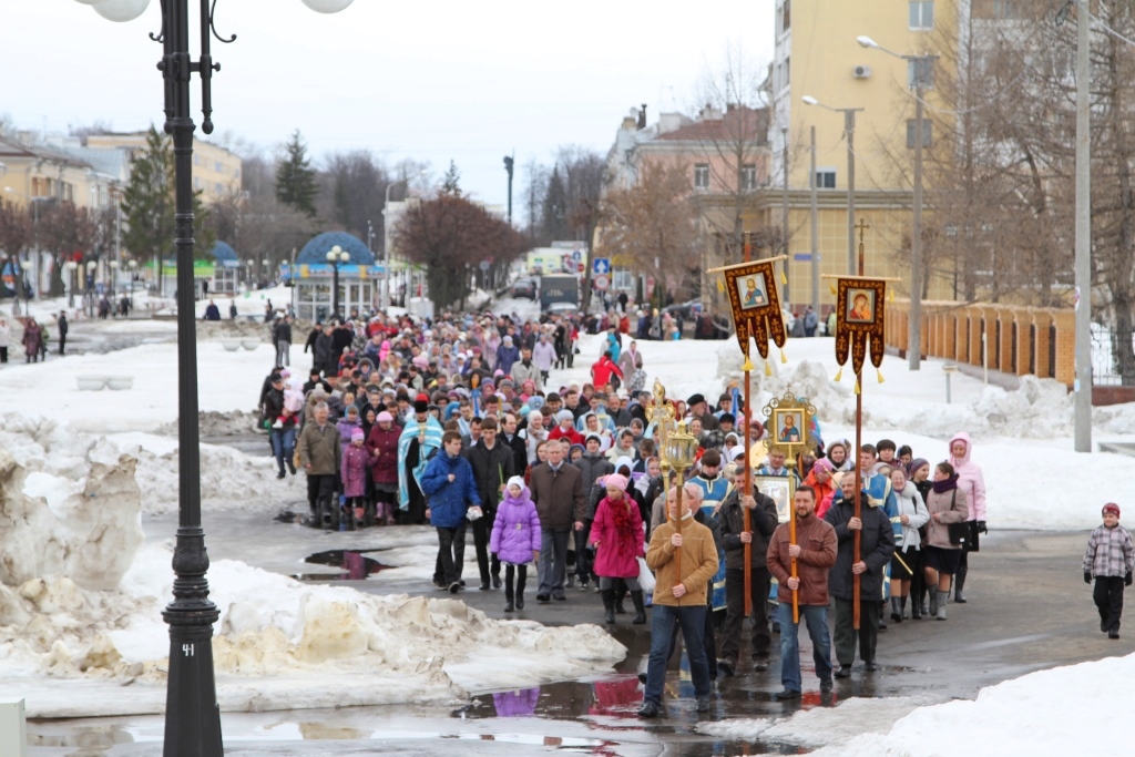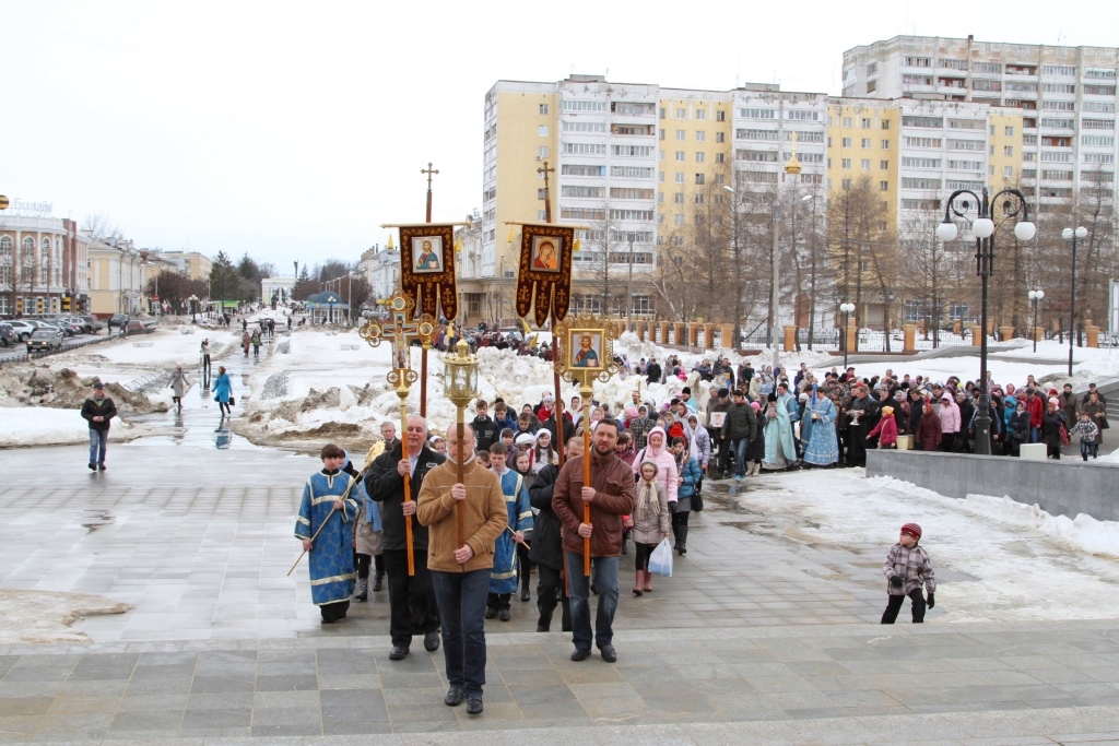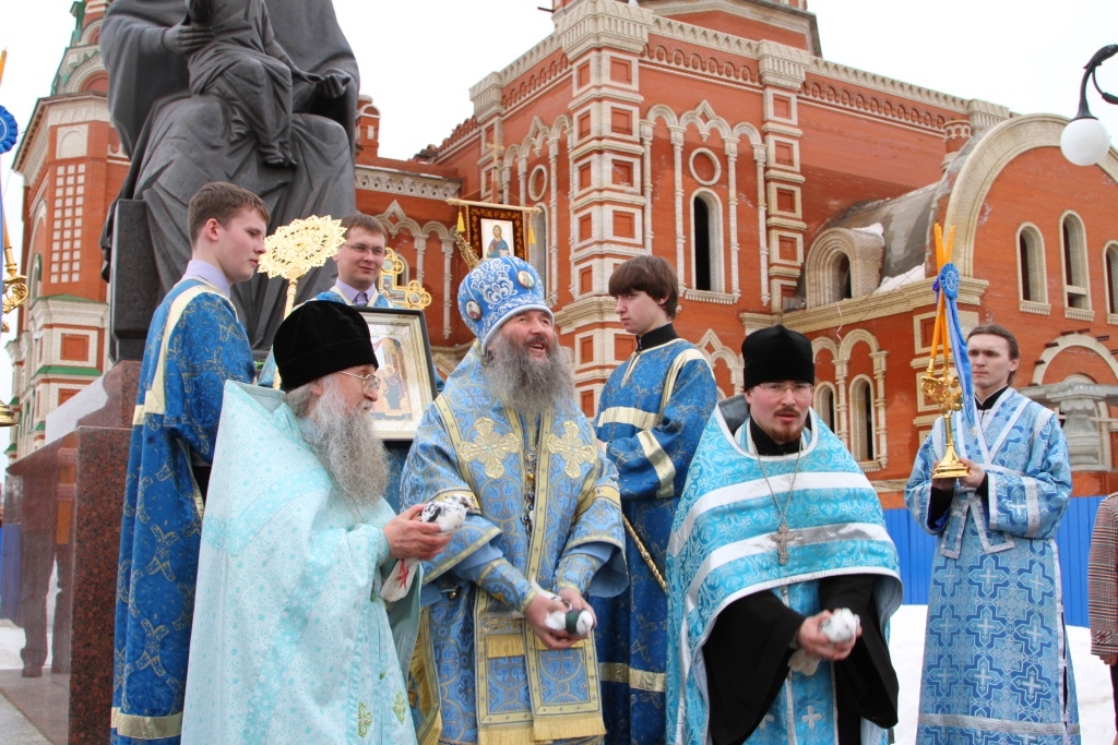 По традиции, после праздничного богослужения прихожане и клир Троицкого храма во главе с владыкой Иоанном совершают Крестный ход к строящемуся на берегу реки Кокшаги Благовещенскому кафедральному Собору. После праздничного молебна у скульптурной композиции «Пресвятая Богородица с младенцем» Высокопреосвященнейший Владыка выпустил в небо трех белых голубей.