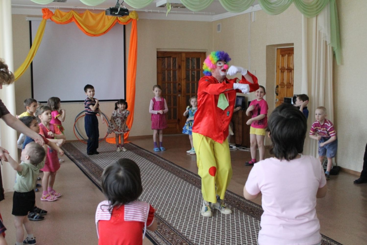 Затем все находившиеся в зале стали участниками праздничного мероприятия. Ребята активно отгадывали пасхальные загадки, играли в игры на сообразительность и находчивость, весело танцевали с клоуном Тошей, дружно участвовали в подвижных играх.