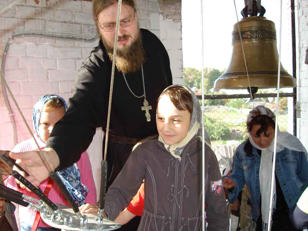 В заключение встречи все присутствующие поднялись на колокольню и попробовали себя в роли звонарей. Это привело детей в неописуемый восторг. Отец Александр рассказал, что колокольный звон благотворно влияет на здоровье человека и на его состояние души.