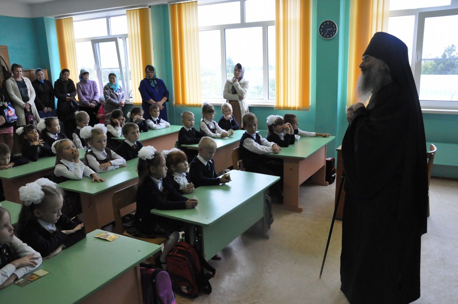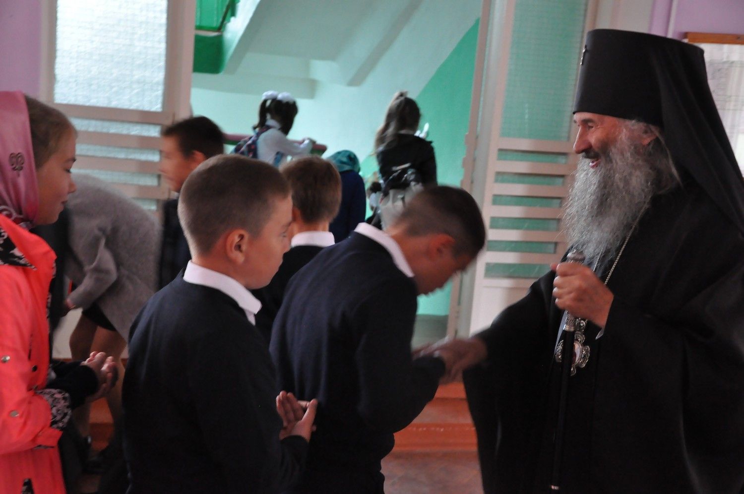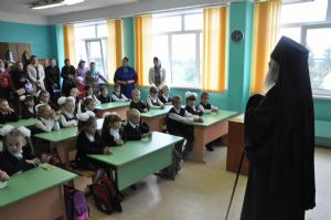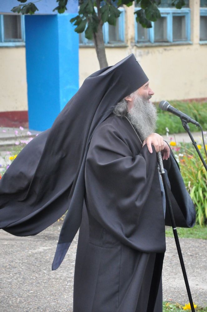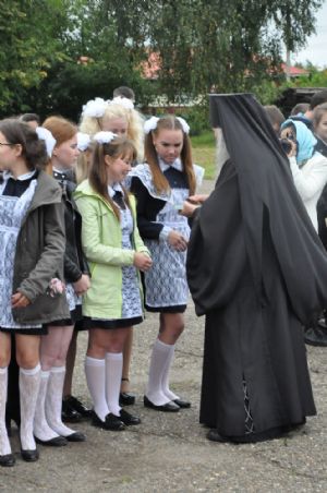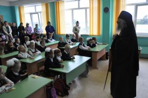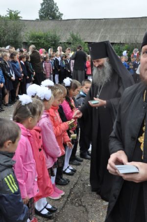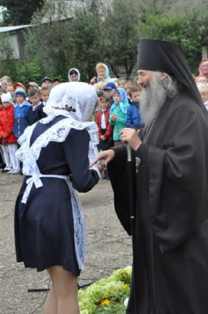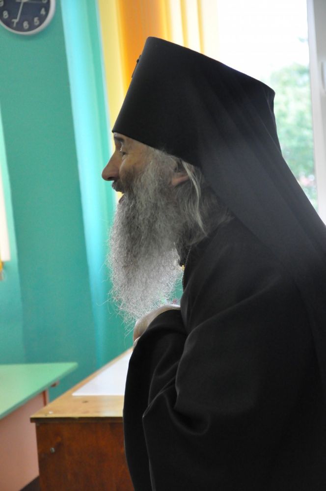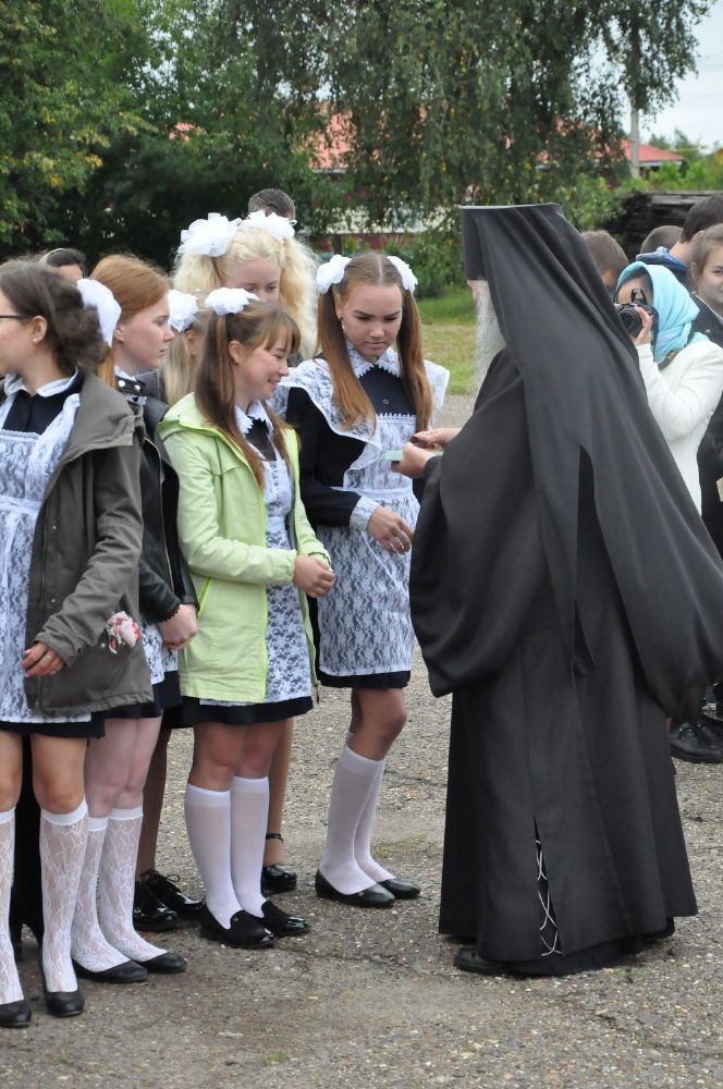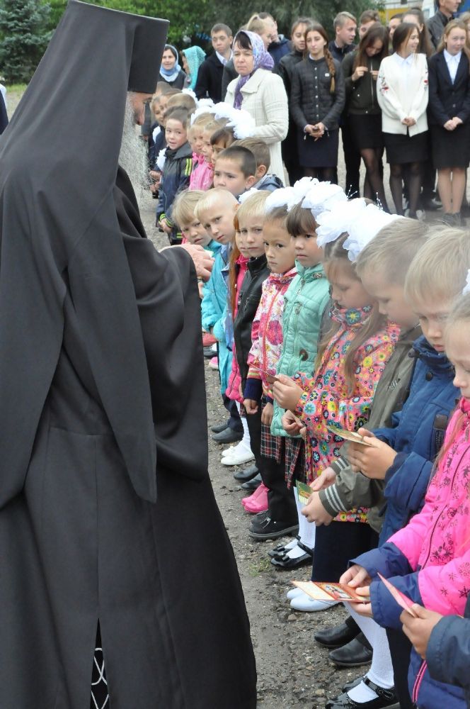 После богослужения владыка Иоанн посетил Большепаратскую среднюю школу. Здесь на общей линейке архипастырь поздравил всех учащихся с началом нового учебного года, а после посетил непосредственно учащихся – 1-х и 11-х классов. Как благословение на учебу владыка Иоанн раздал ученикам иконки.