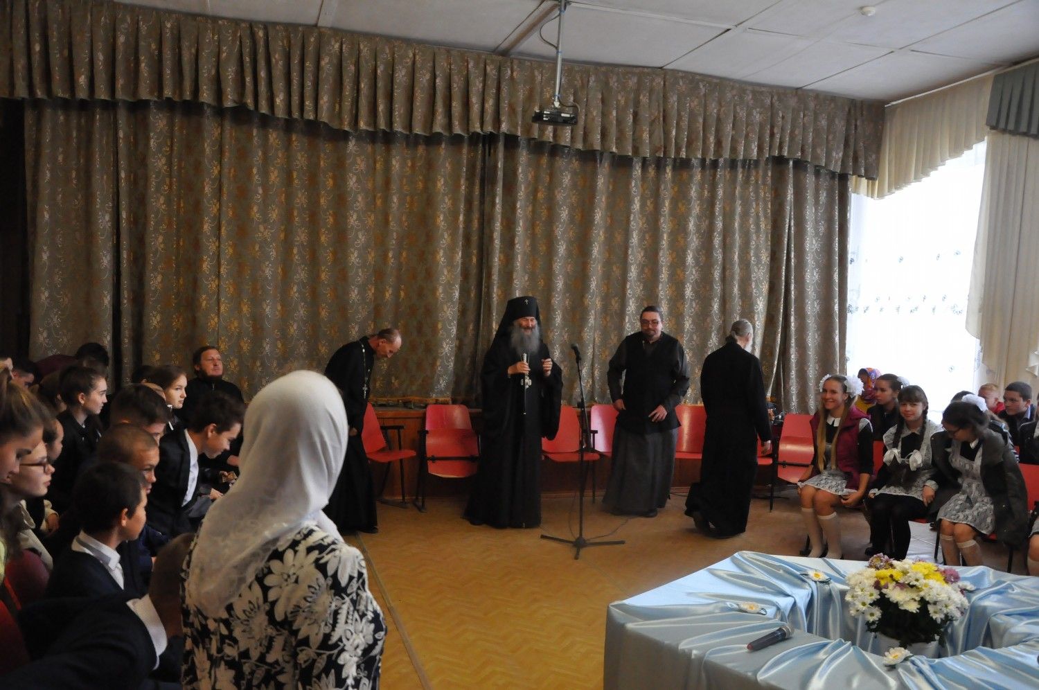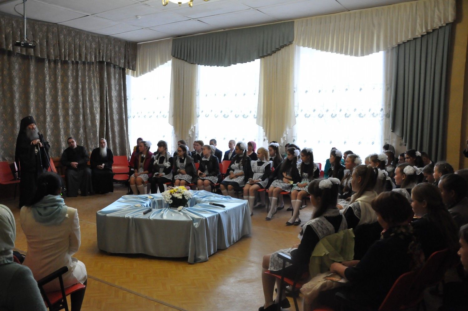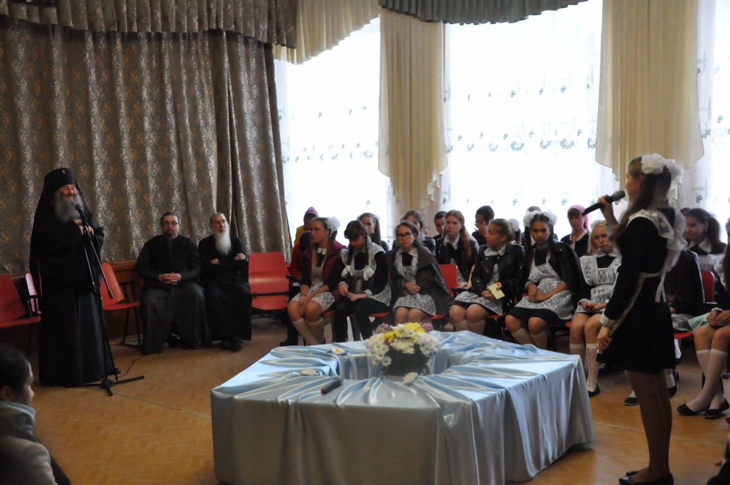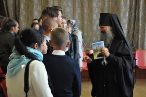 С выпускным курсом был проведен круглый стол. Владыка рассказал о необходимости твердой веры в открывающейся за порогами школы жизни, опасностях, подстерегающих молодых людей в информационный век. В завершении визита архипастырь ответил на вопросы учеников.