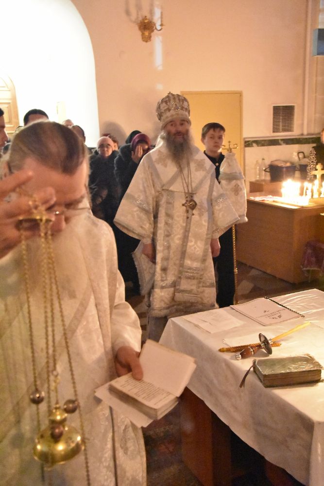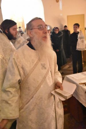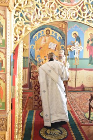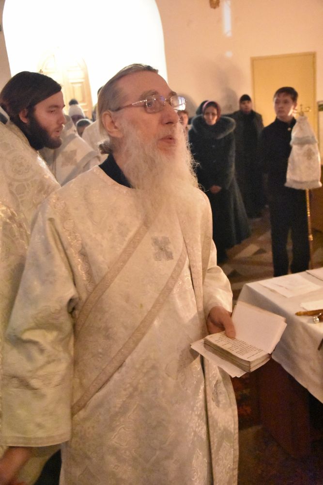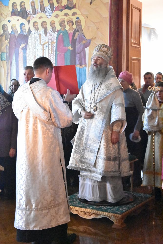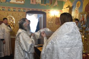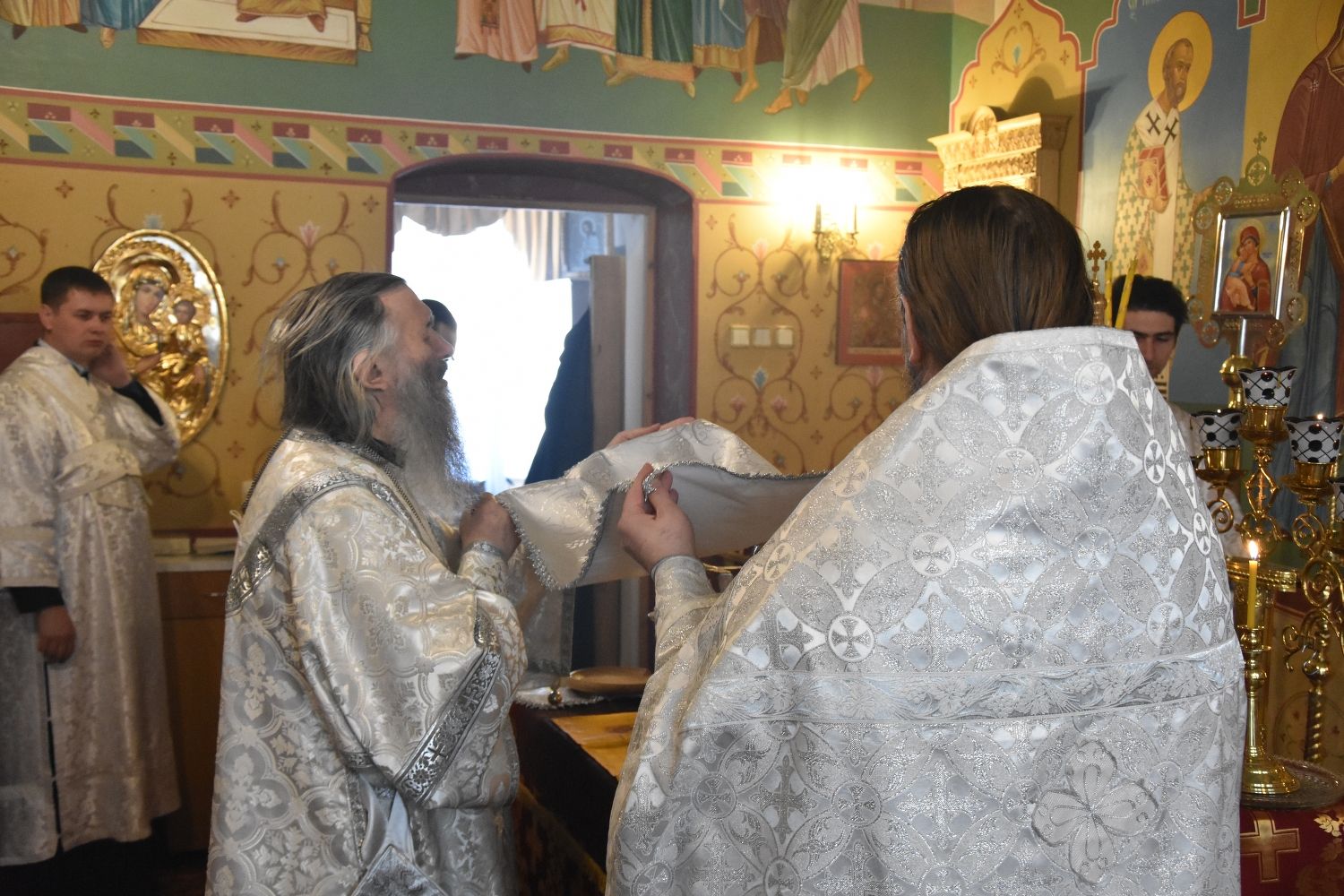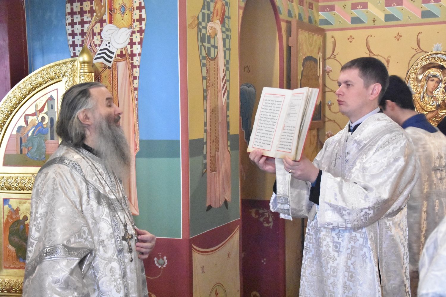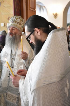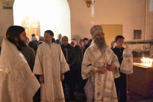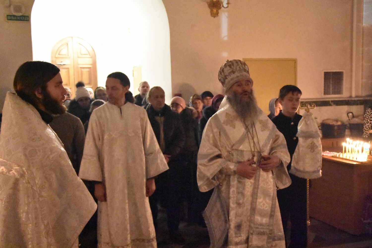 Владыке сослужили настоятель собора иерей Алексий Кирюшкин, клирики собора иерей Леонид Вылекжанин, иерей Андрей Кочаков и клирик храма Рождества Пресвятой Богородицы села Семеновка протодиакон Михаил Козловский.