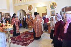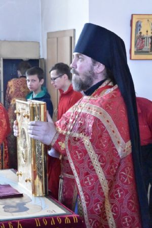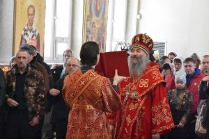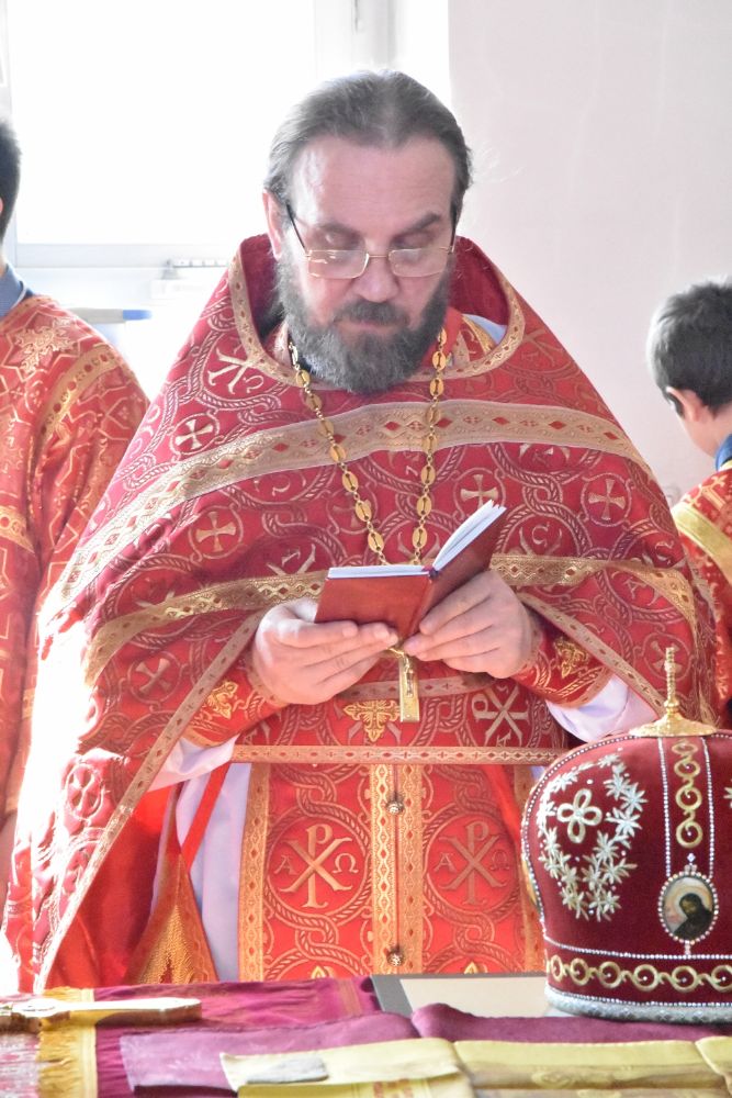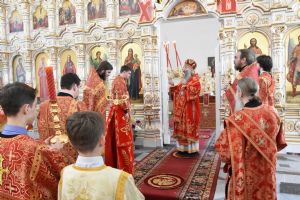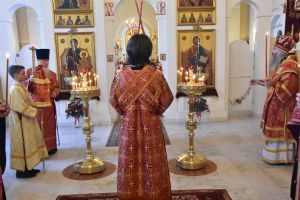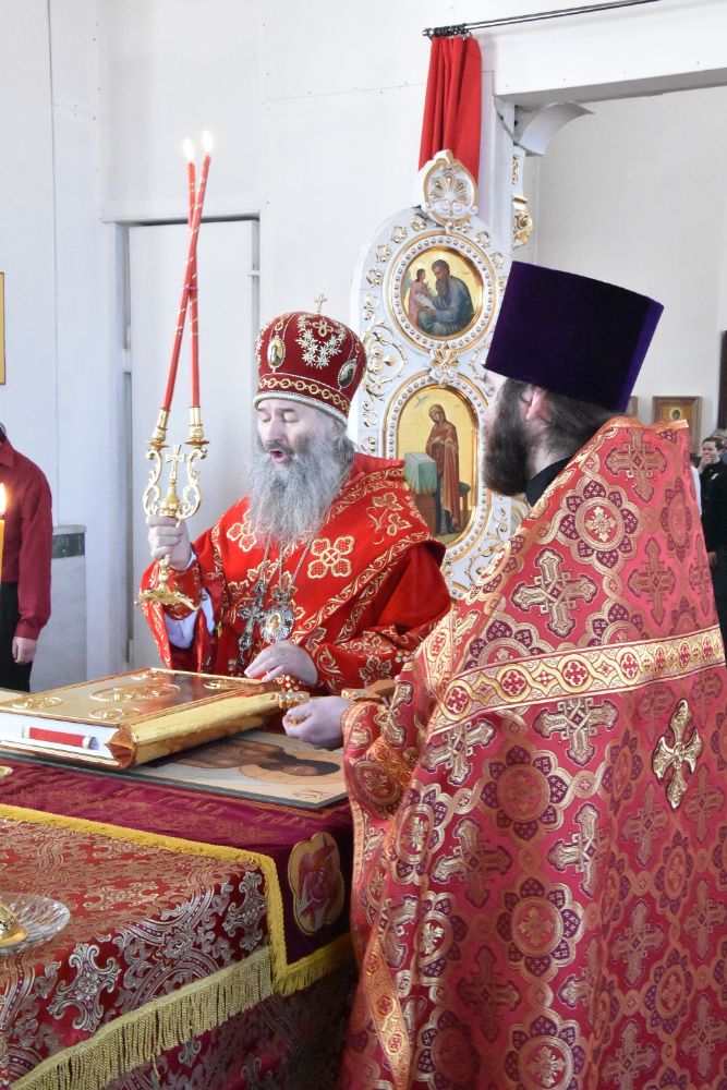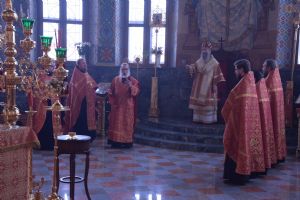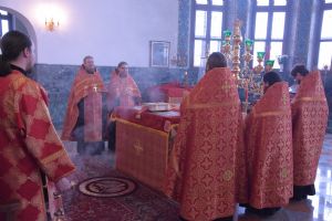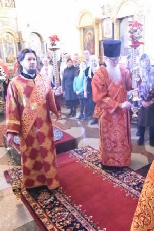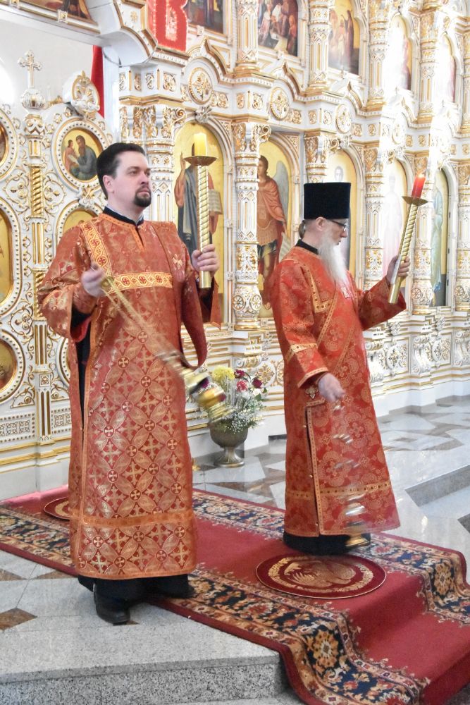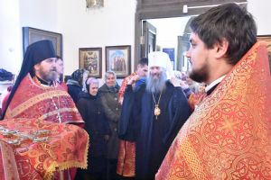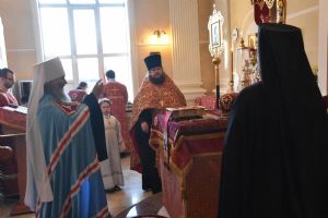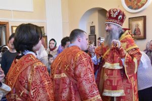 Владыке сослужили секретарь Епархиального управления иеромонах Серафим (Пасанаев), настоятель храма митрофорный протоиерей Сергий Филонов, клирики храма иерей Алексий Михеев, иерей Алексей Семенов, иерей Никита Иванов, диакон Александр Мельников и клирик храма Рождества Пресвятой Богородицы села Семеновка протодиакон Михаил Козловский.