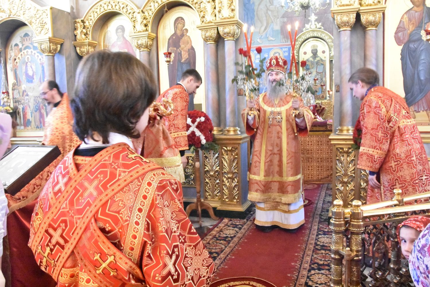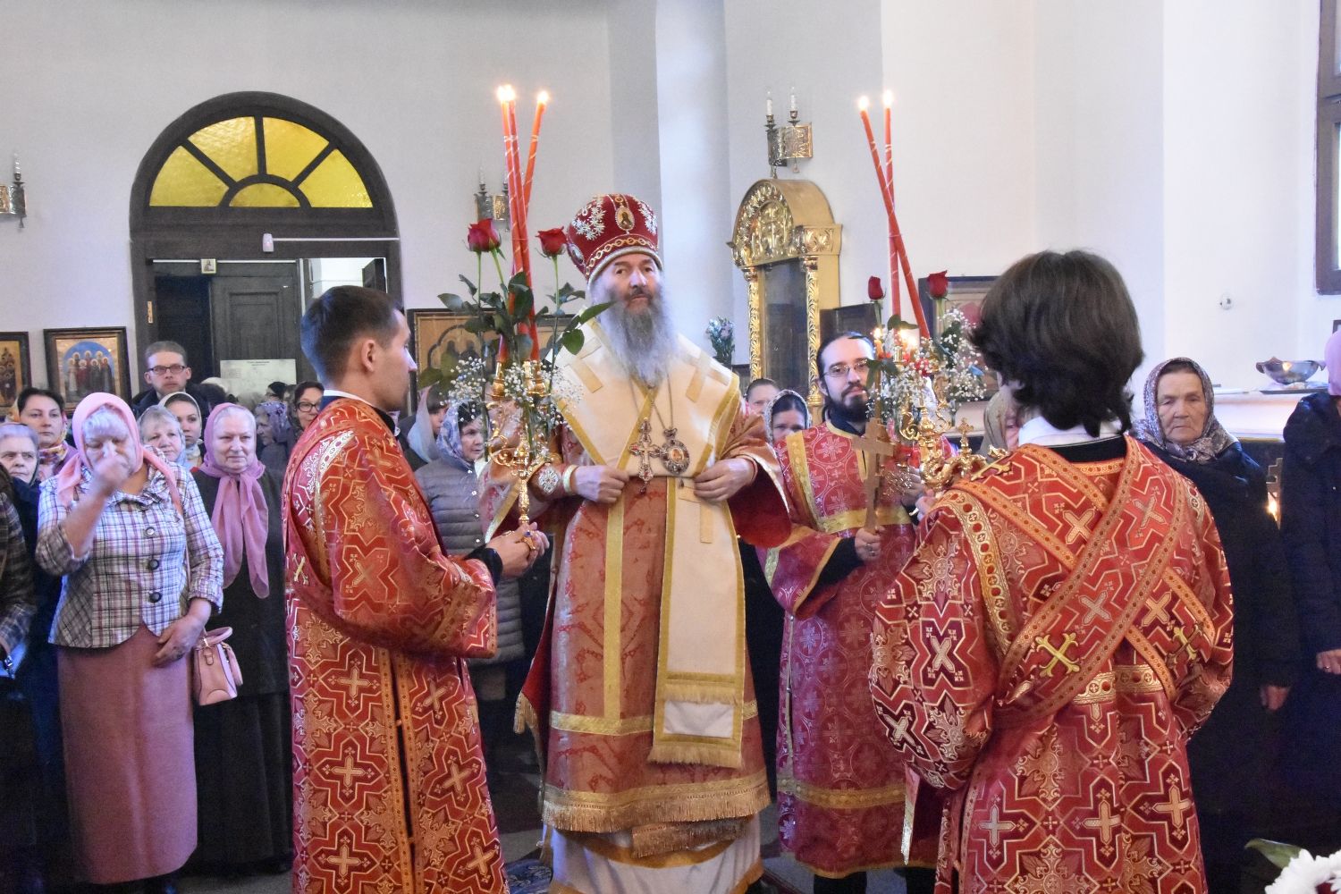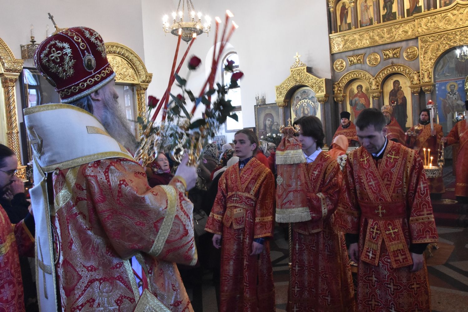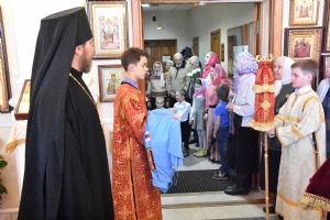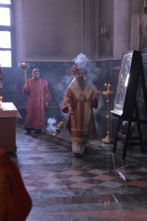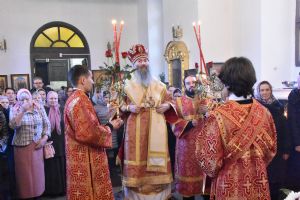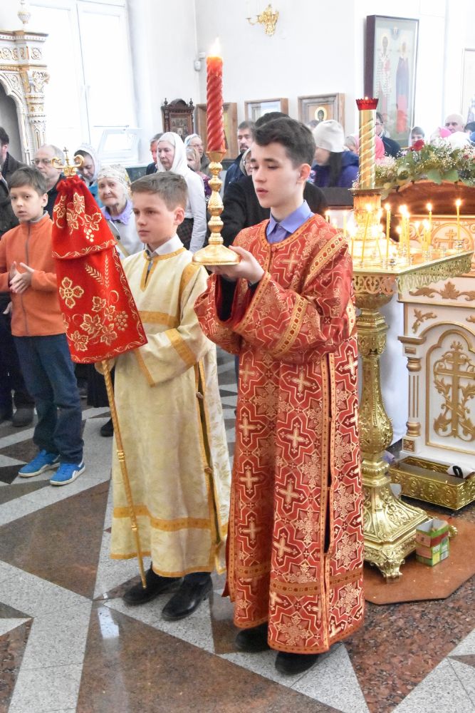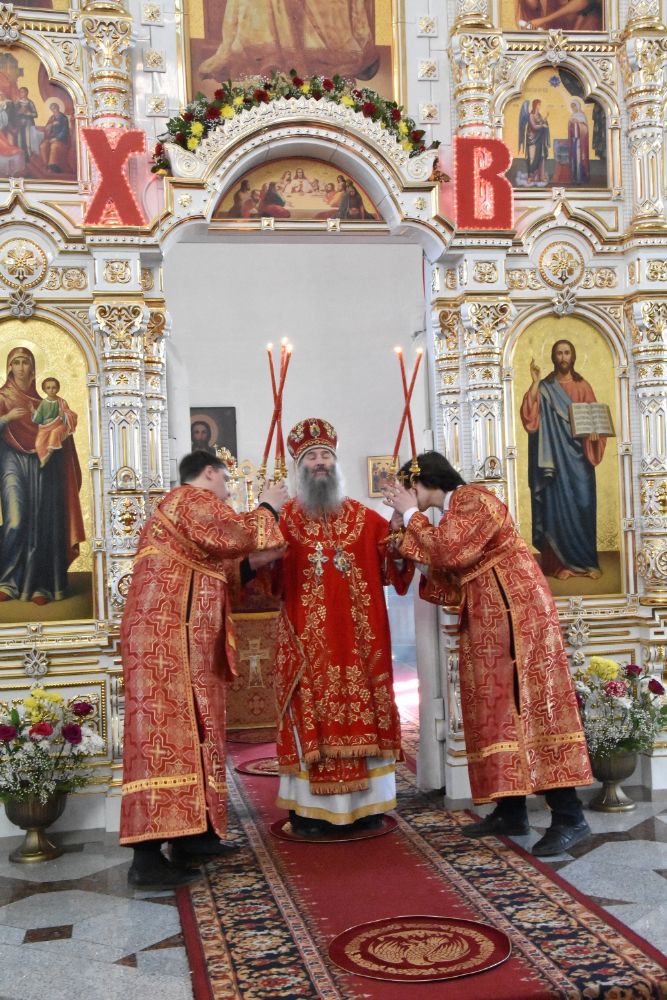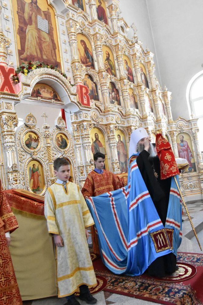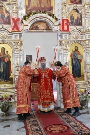 Служба совершалась по пасхальному чину. Богослужение началось торжественной встречей архипастыря. За богослужением песнопения исполнял хор под управлением регента Татьяны Черновой.