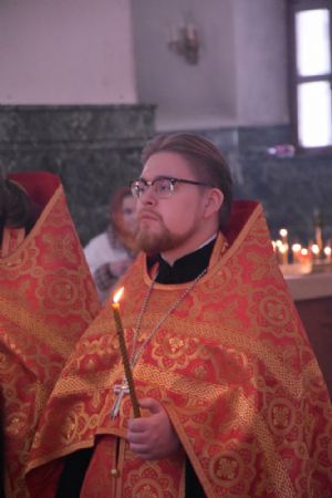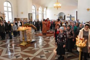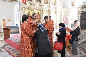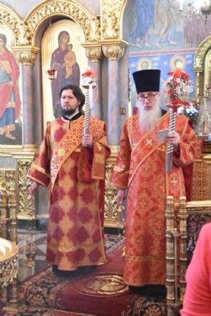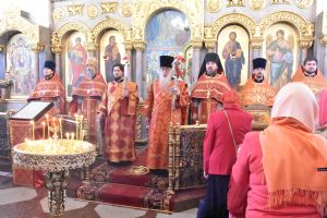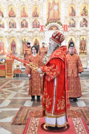 Владыке сослужили секретарь Епархиального управления иеромонах Серафим (Пасанаев), ключарь собора протоиерей Сергий Поглазов, клирики иерей Никифор Захаров, иерей Артемий Промович, иерей Евгений Самойлов, диаконы Андрей Дружинин и Игорь Коваль и клирик храма Рождества Пресвятой Богородицы села Семеновка протодиакон Михаил Козловский.
