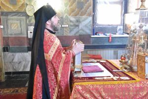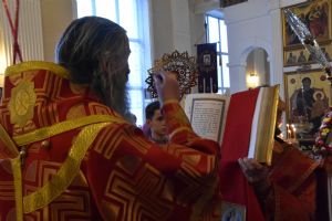 Владыке сослужили секретарь Епархиального управления иеромонах Серафим (Пасанаев), настоятель храма протоиерей Евгений Сурков и клирик храма Рождества Пресвятой Богородицы села Семеновка протодиакон Михаил Козловский.