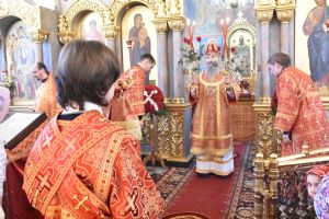 Богослужение началось торжественной встречей архипастыря. За литургией песнопения исполнял хор под управлением регента Елены Поглазовой. За богослужением читались отрывки из книги Деяний Апостолов (5 глава) о многочисленных чудесах, совершаемых апостолами, и из Евангелия от Иоанна (20 глава) о явлении Господа Иисуса одиннадцати ученикам через неделю после Воскресения.