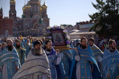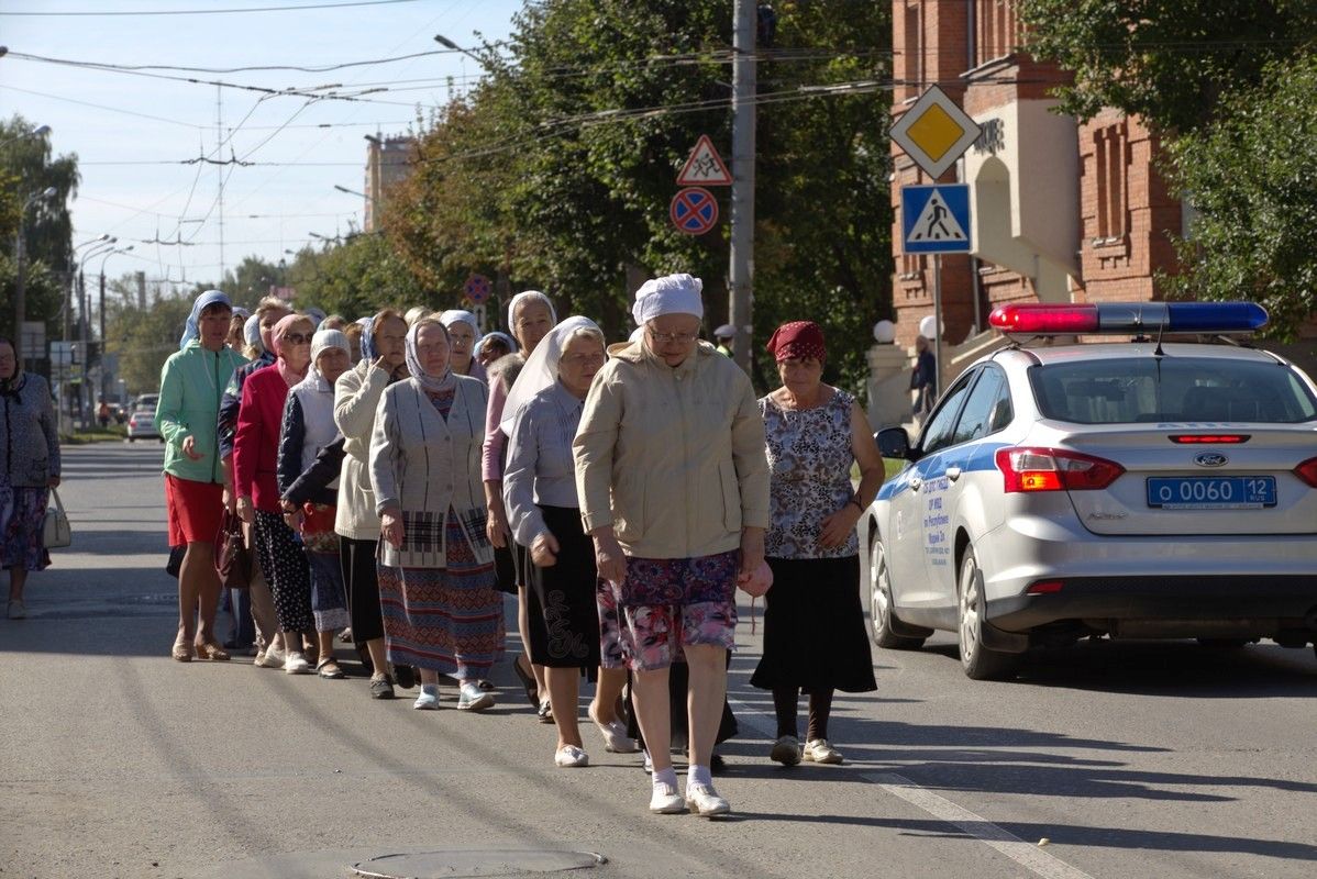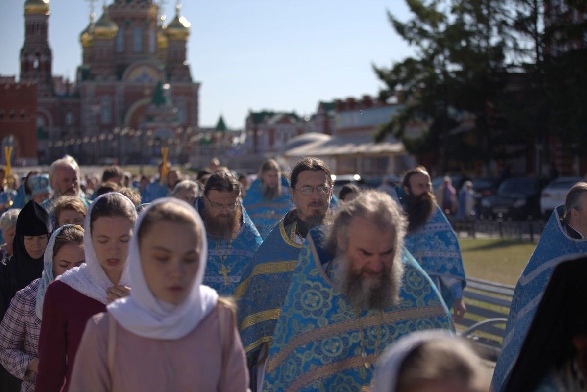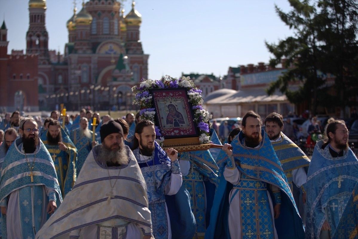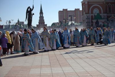 После Божественной литургии сонм священнослужителей во главе с Владыкой отправился крестным ходом с Мироносицкой иконой Пресвятой Богородицы в Успенский храм. Вместе с ними крестным ходом шли многочисленные верующие из Йошкар-Олы и районов республики.
