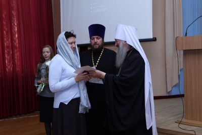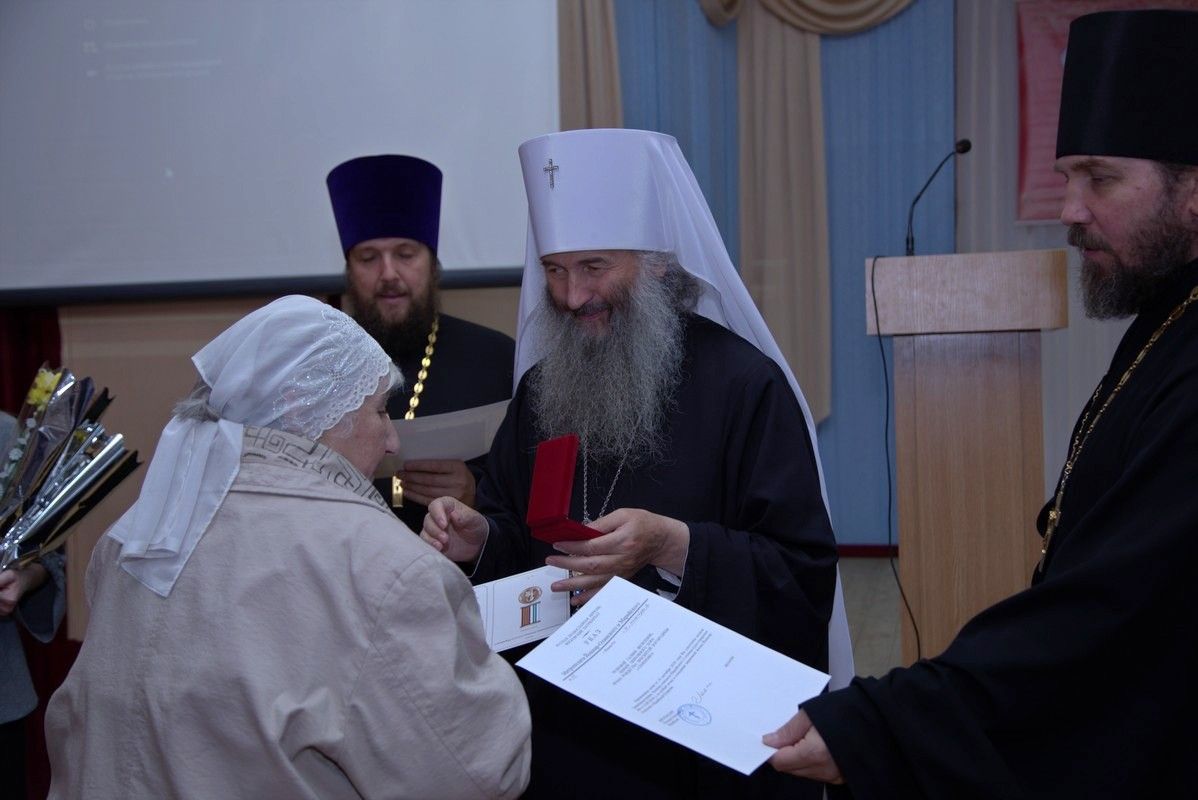 Собрание продолжилось наградной частью. Указом Святейшего Патриарха Кирилла юбилейной медалью РПЦ к 1030-летию Крещения Руси награждена Лебедева Галина Александровна, заместитель директора по учебно-воспитательной работе Кадамской основной общеобразовательной школы. За заслуги перед Йошкар-Олинской епархией медалью священномученика Леонида, епископа Марийского были награждены миряне, потрудившиеся во славу Божию.