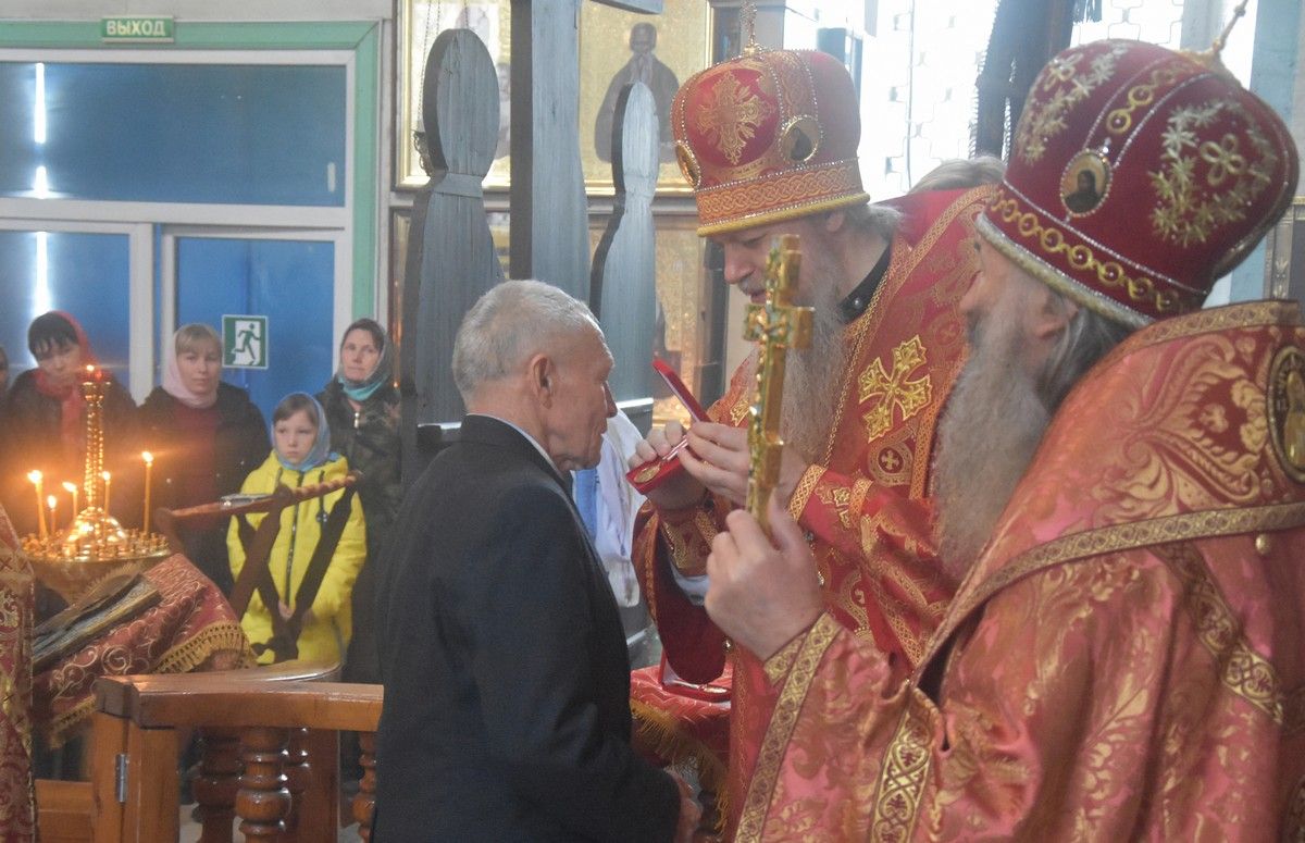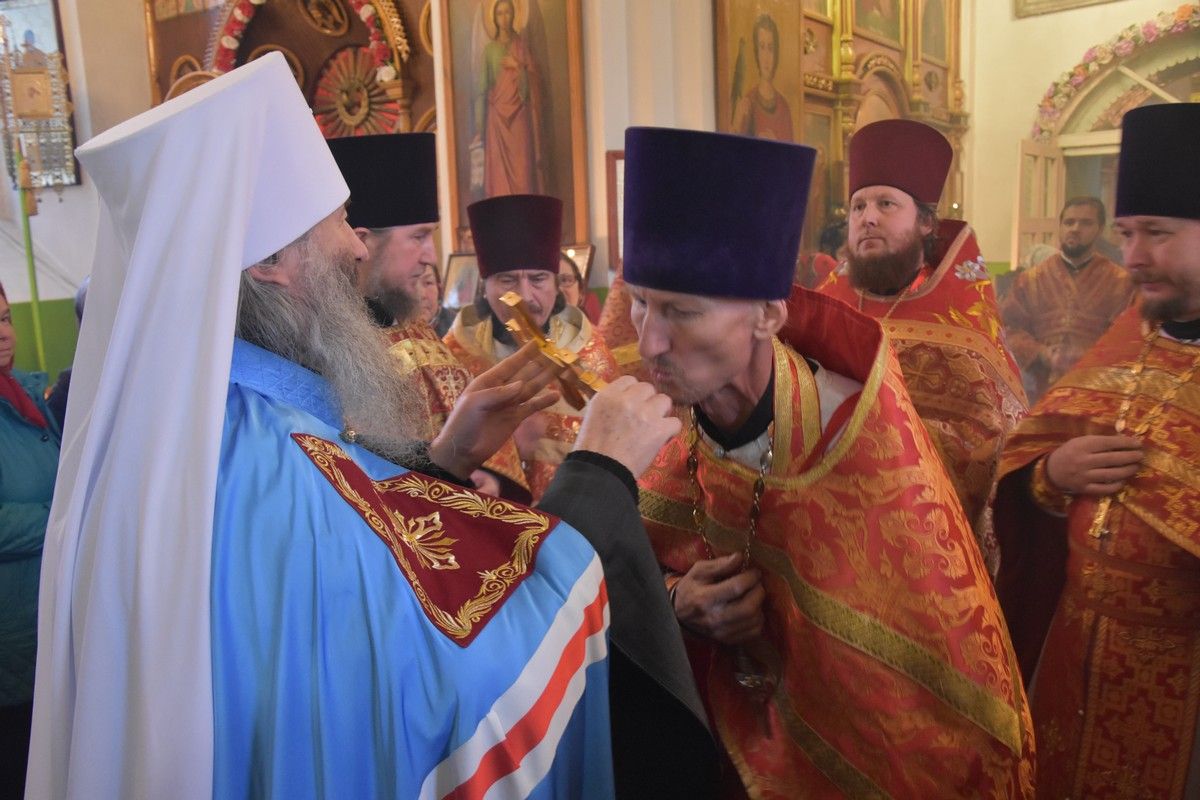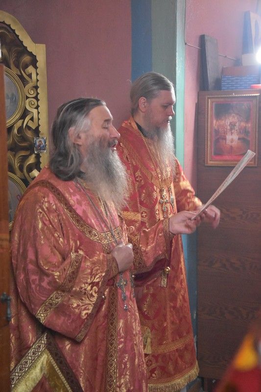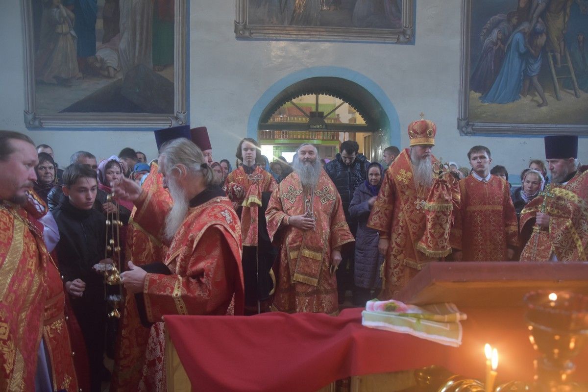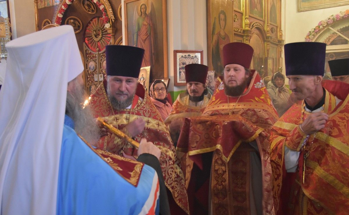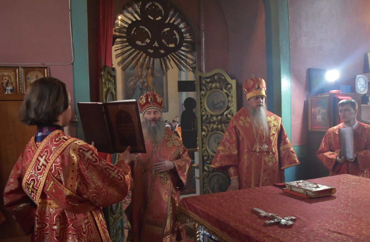 Сослужили архипастырям: настоятель храма протоиерей Евгений Бакутов, настоятель храма Богоявления Господня п. Морки протоиерей Леонтий Очетов, настоятель храма Покрова Пресвятой Богородицы с. Эмеково протоиерей Евгений Усков, клирик кафедрального собора святителя Николая Мирликийского г. Волжска иерей Александр Усков, клирик храма праведного Иоанна Кронштадтского г. Волжск иерей Матвей Сапаев и клирик храма Рождества Пресвятой Богородицы с. Семеновка протодиакон Михаил Козловский.