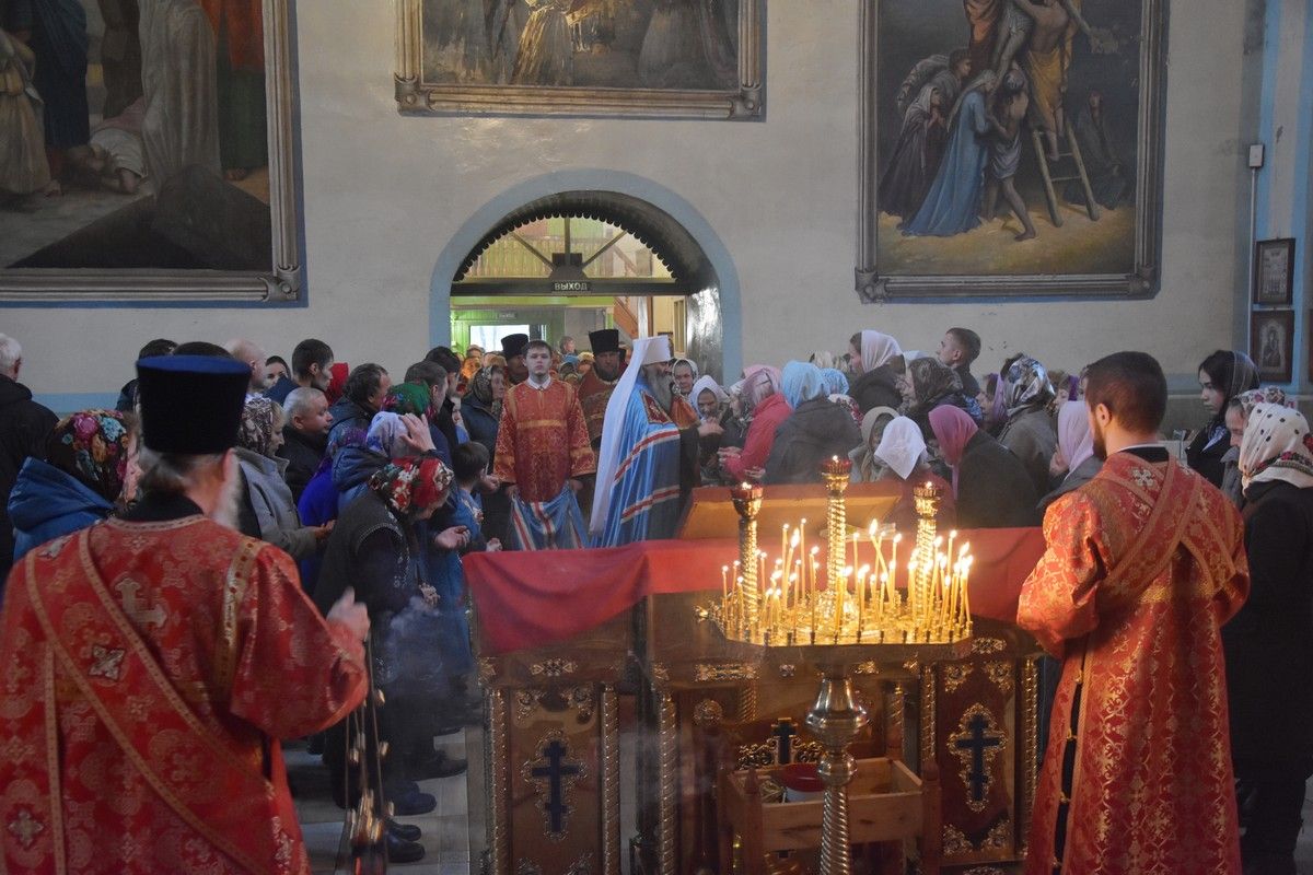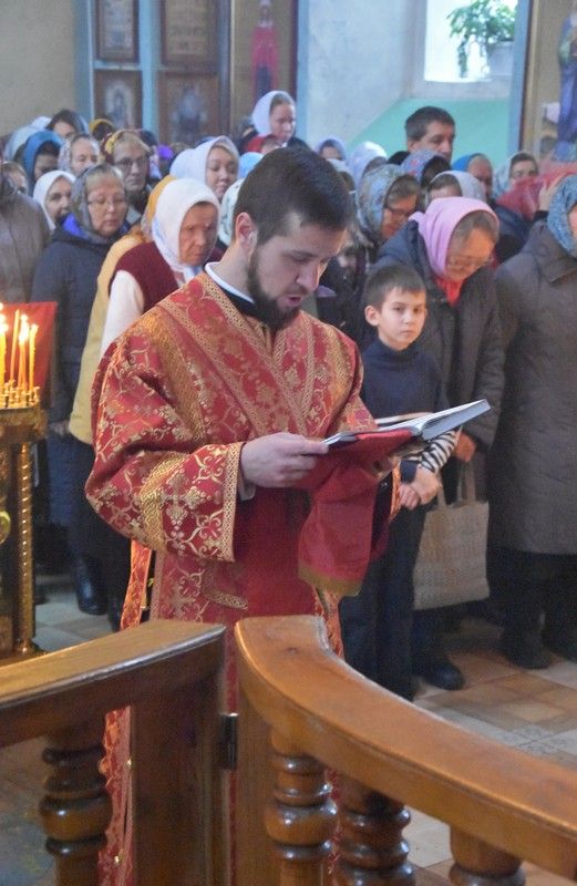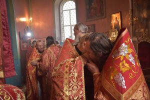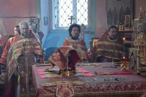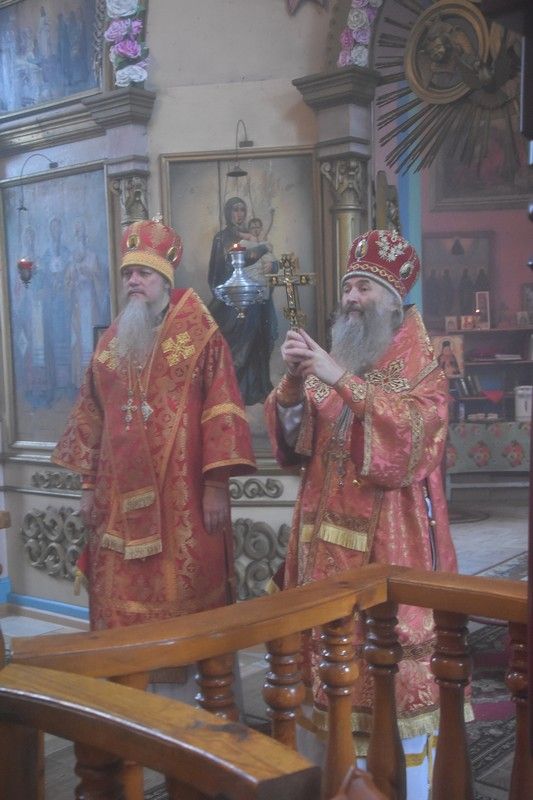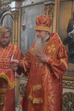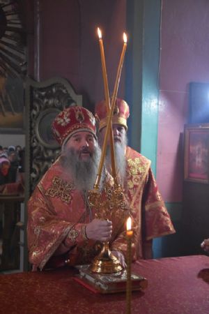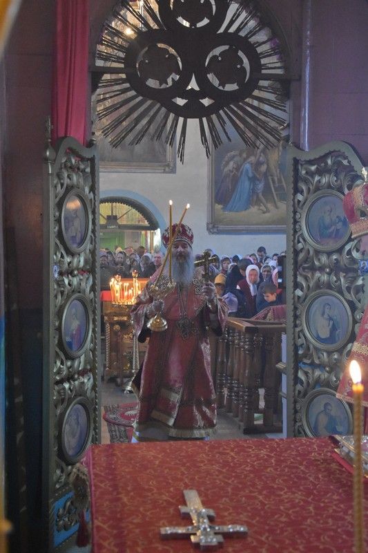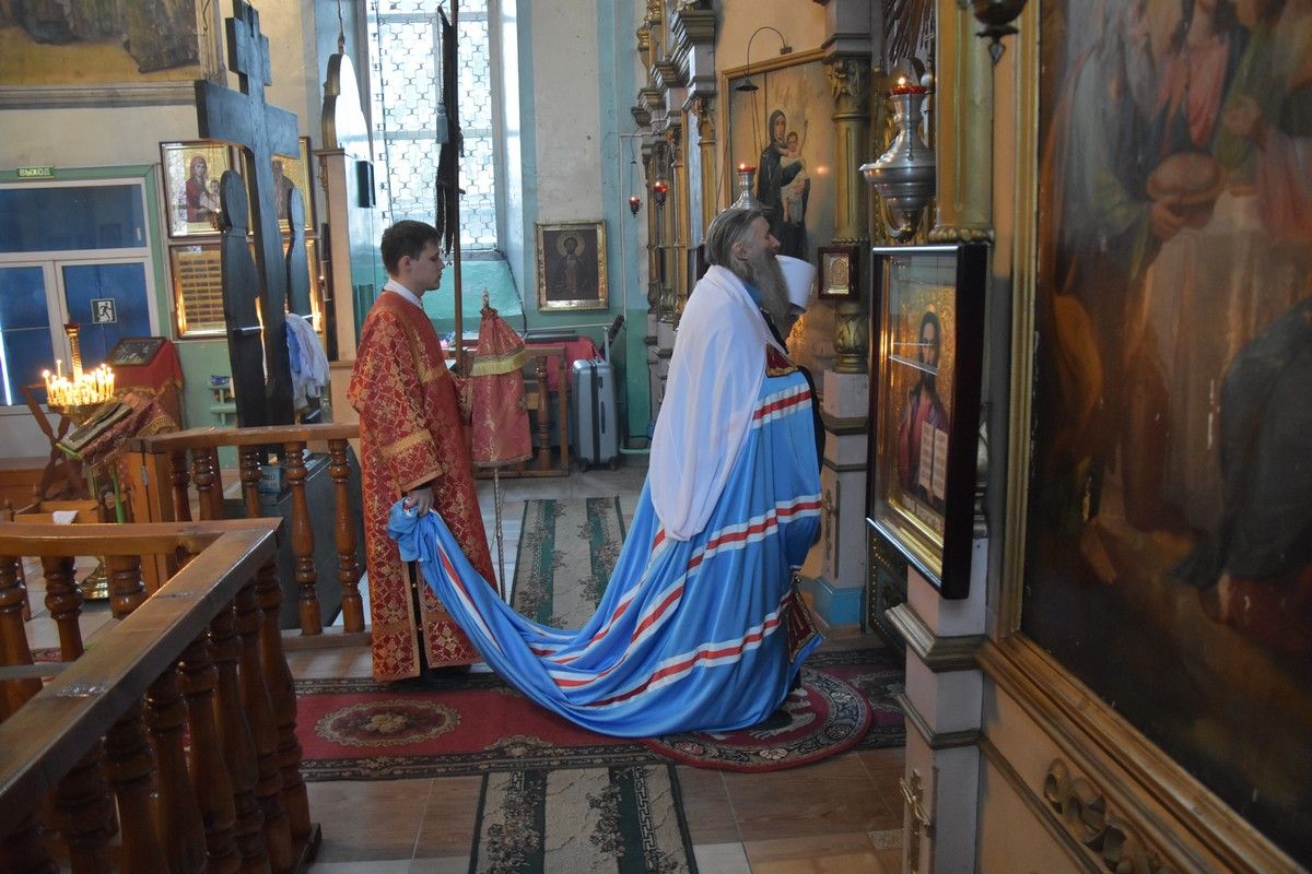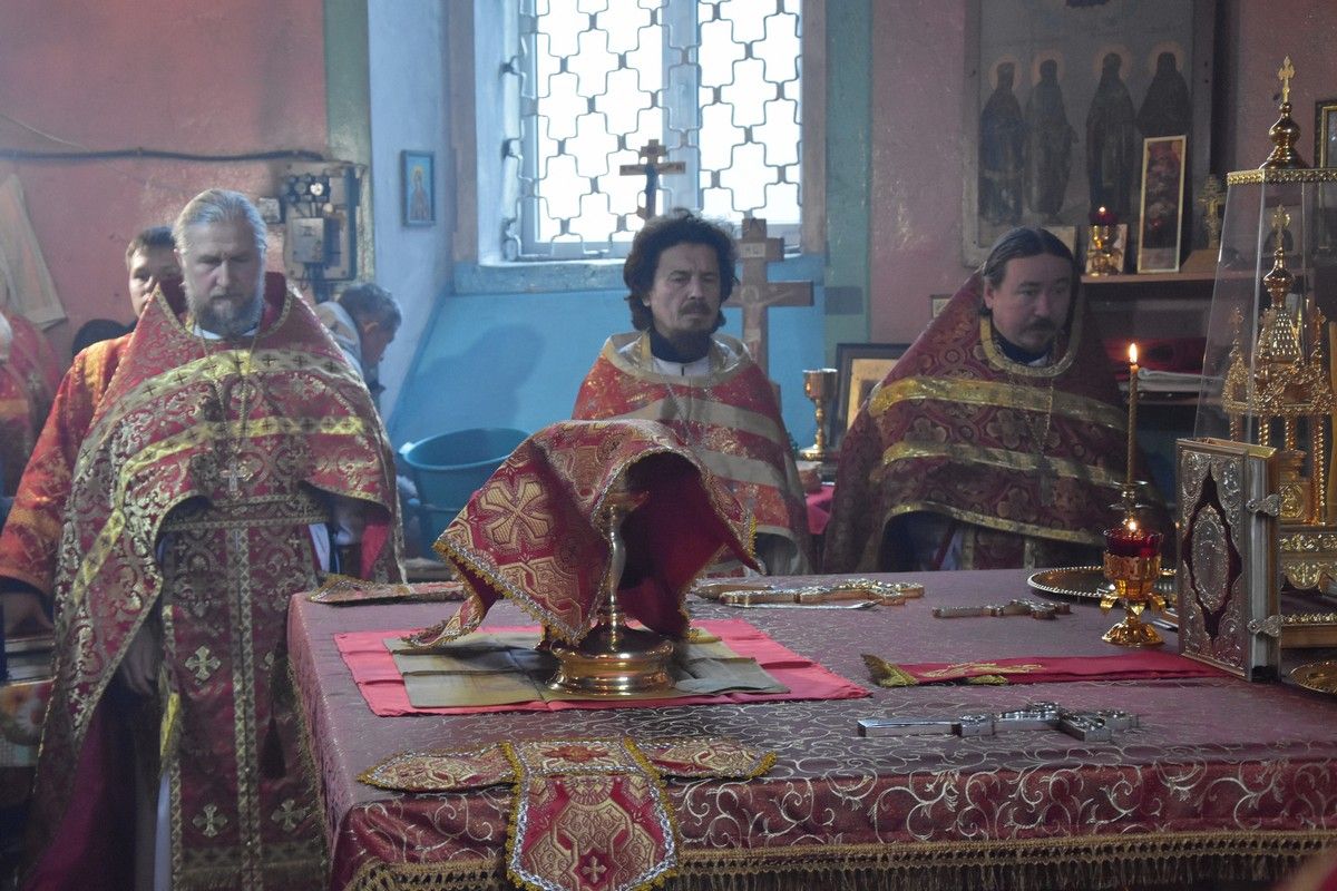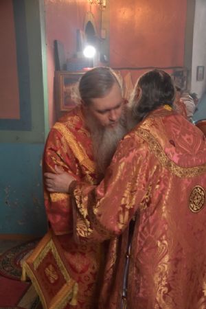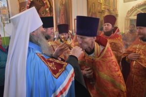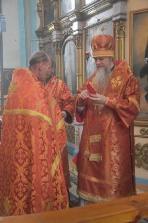 Сослужили архипастырям: настоятель храма протоиерей Евгений Бакутов, настоятель храма Богоявления Господня п. Морки протоиерей Леонтий Очетов, настоятель храма Покрова Пресвятой Богородицы с. Эмеково протоиерей Евгений Усков, клирик кафедрального собора святителя Николая Мирликийского г. Волжска иерей Александр Усков, клирик храма праведного Иоанна Кронштадтского г. Волжск иерей Матвей Сапаев и клирик храма Рождества Пресвятой Богородицы с. Семеновка протодиакон Михаил Козловский.