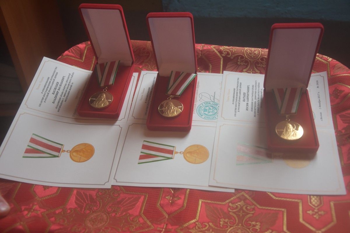 Владыка Феофан в ознаменование 100-летния восстановления Патриаршества вручил патриаршие юбилейные медали: настоятелю храма Покрова Пресвятой Богородицы с. Эмеково протоиерею Евгению Ускову, помощнику настоятеля храма великомученика Димитрия Солунского с. Новые Параты Катаеву Иосифу Лаврентьевичу и псаломщику храма Покрова Пресвятой Богородицы с. Эмеково Васильеву Владимиру Васильевичу.