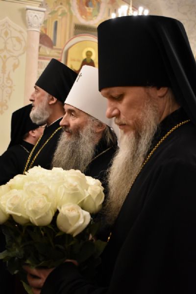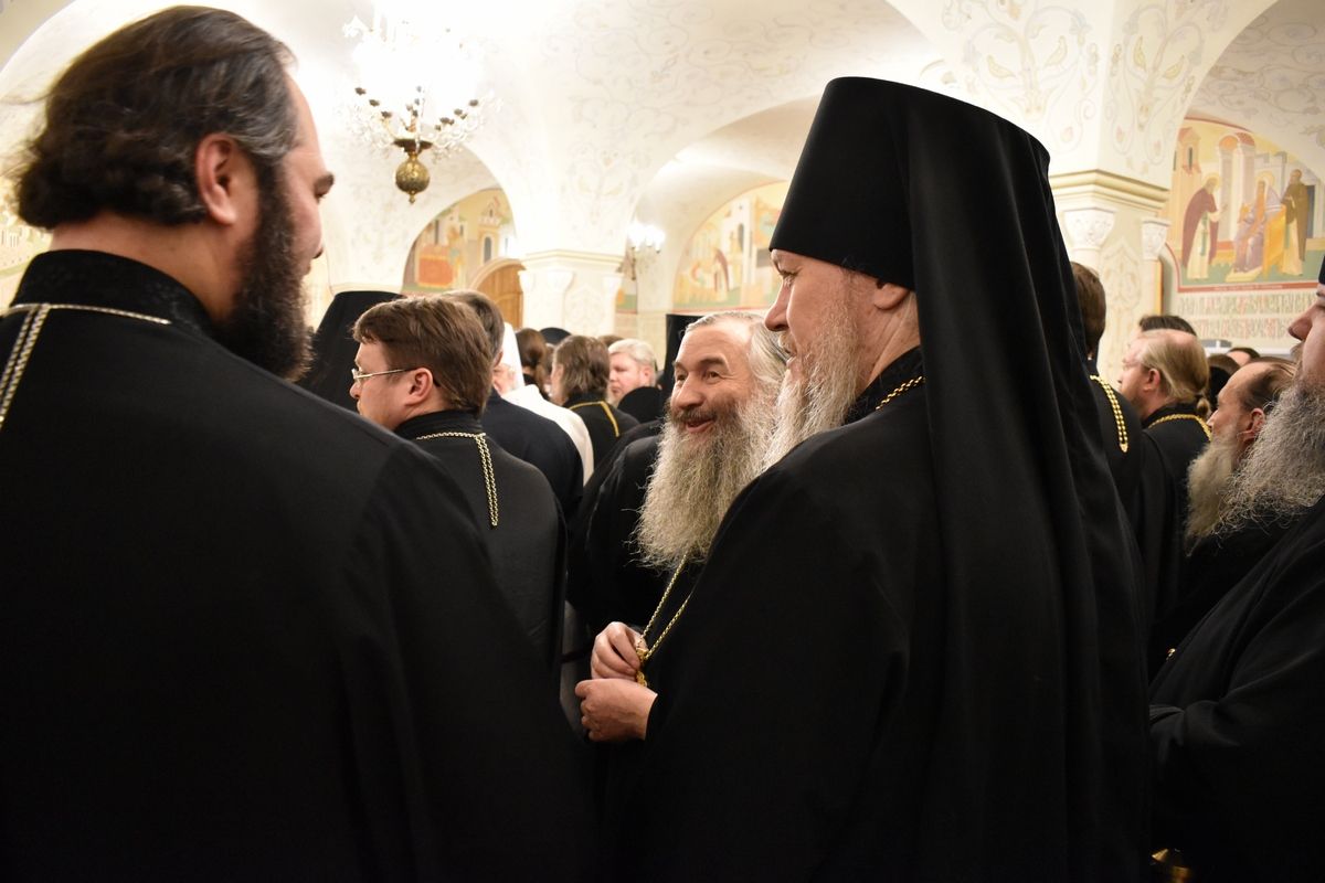После Богослужения и трапезы архиереи и священство поздравляли Святейшего патриарха Кирилла с 10-летием интронизации. Митрополит Иоанн и епископ Феофан преподнесли Мироносицкую икону Божией Матери и цветы.