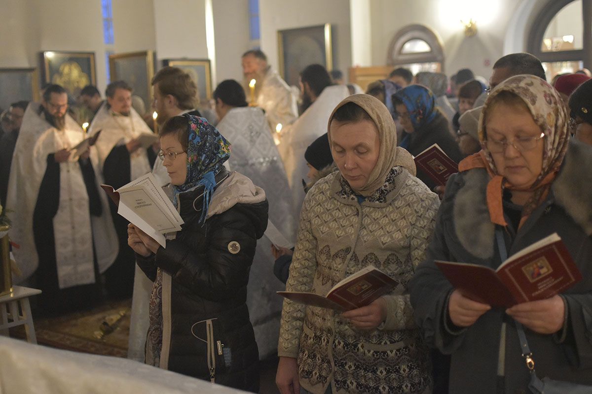Песнопения исполнял хор храма Рождества Христова под руководством регента Наталии Поповой. Акафист пели вместе со священством прихожане.