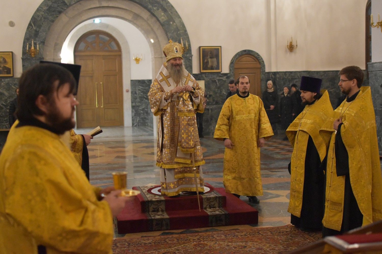 Владыке сослужили секретарь Йошкар-Олинского епархиального управления иеромонах Серафим (Пасанаев), клирики собора иереи Никифор Захаров, Артемий Промович, Евгений Самойлов, диаконы Андрей Дружинин, Игорь Коваль и клирик храма Рождества Пресвятой Богородицы с. Семеновка протодиакон Михаил Козловский.