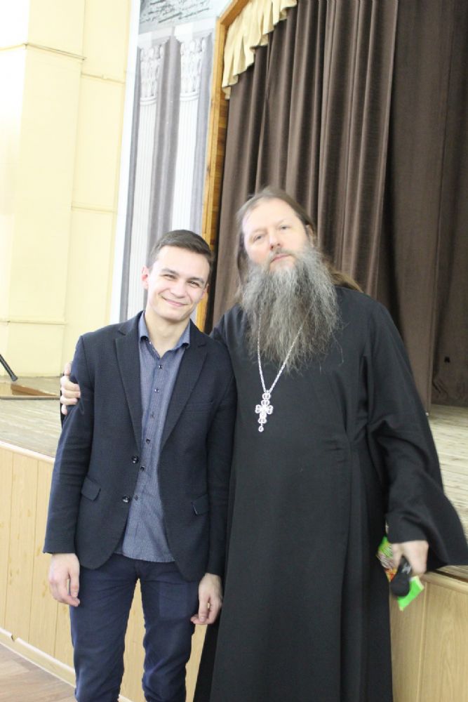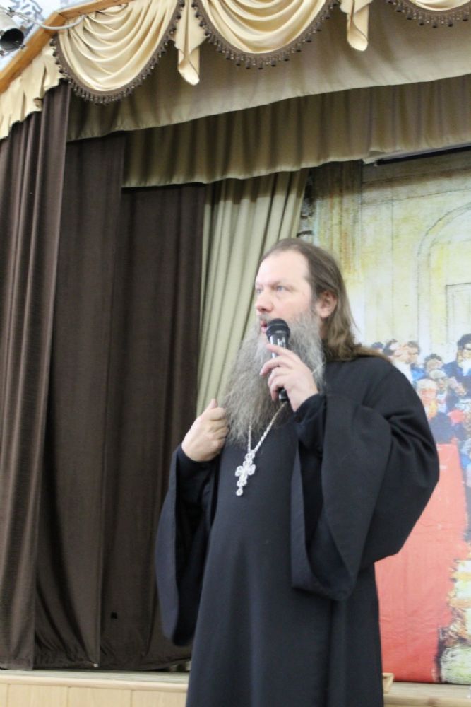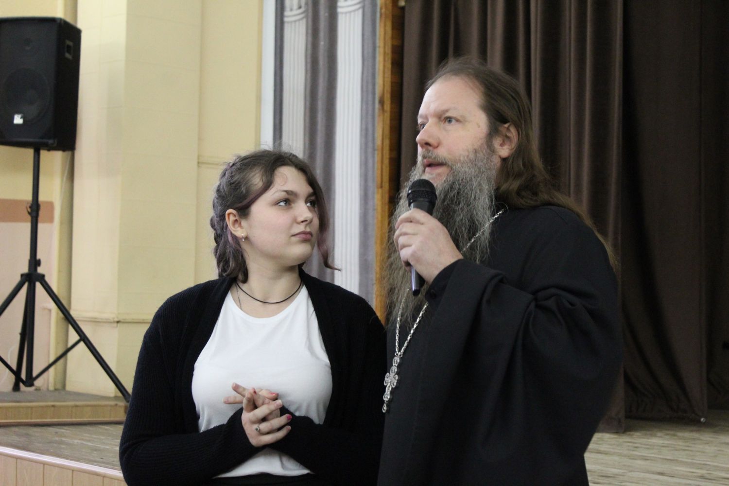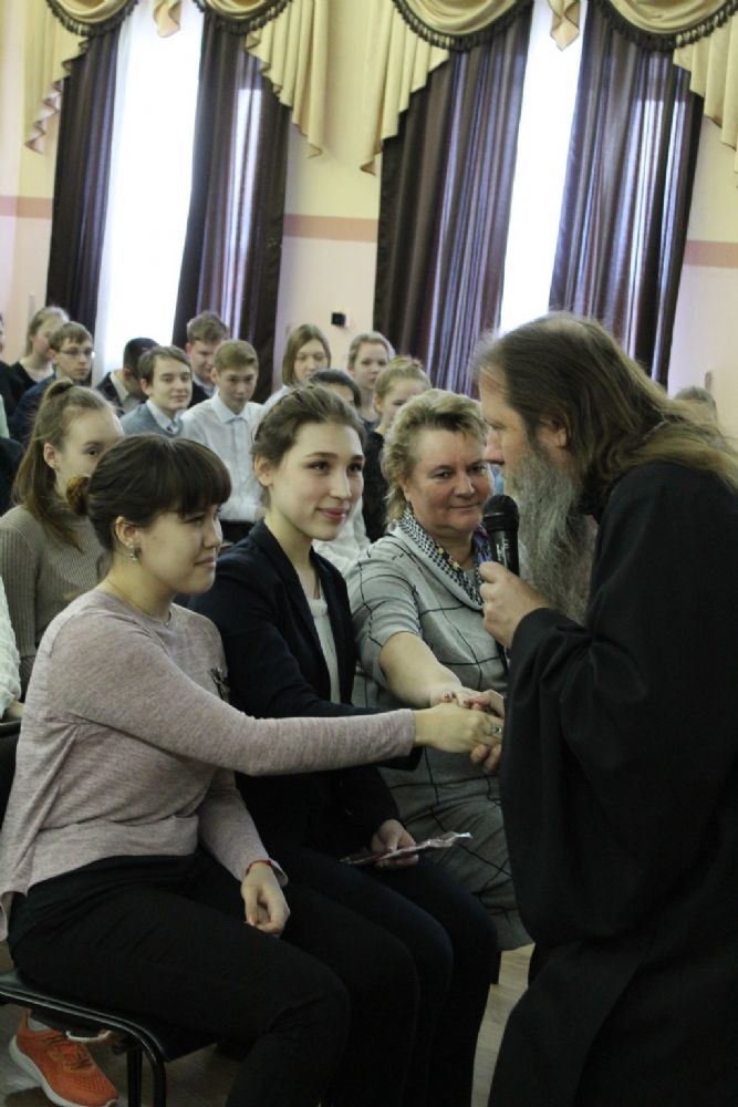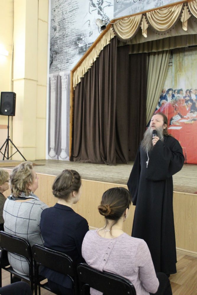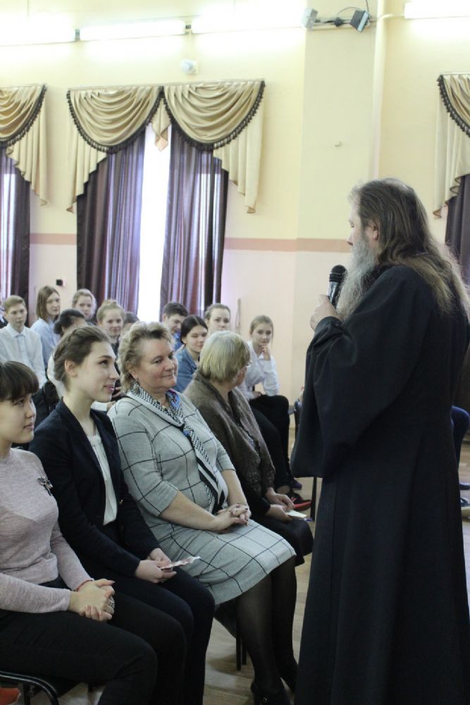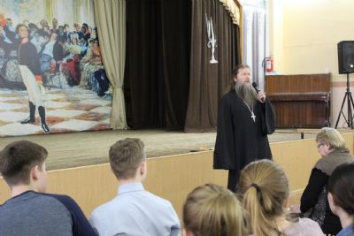 В средней школе №9 им. А.С. Пушкина города Волжска 11 февраля педагог высшей категории, старший священник и духовник Алексеевского ставропигиального женского монастыря Москвы протоиерей Артемий Владимиров провел встречу со старшеклассниками.