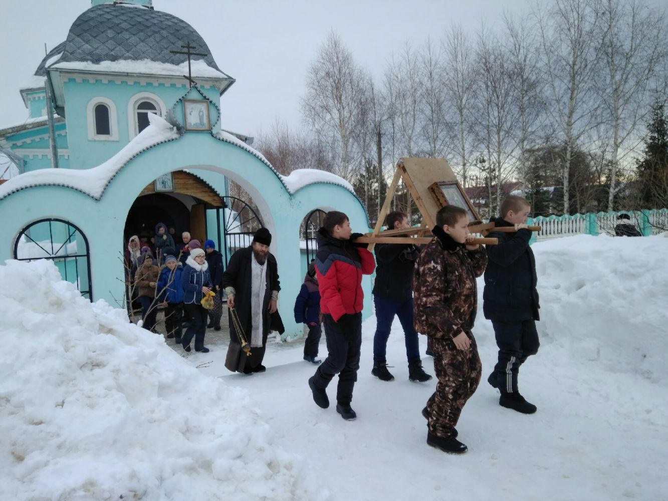 После Божественной литургии прихожане храма, воспитанники воскресной школы, члены молодежного клуба "ДВД" и все желающие отметить этот праздник всесте с приходом, собрались около храма, где начался крестный ход, возглавляемый протоиереем Николаем Полежайкиным.