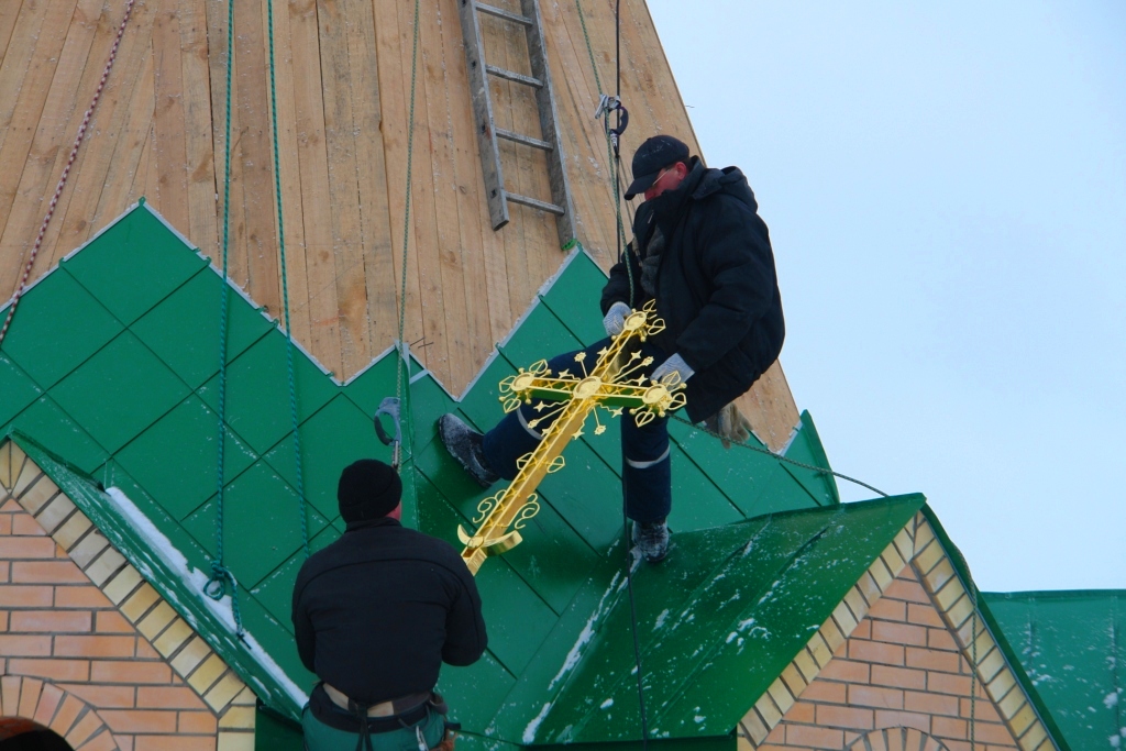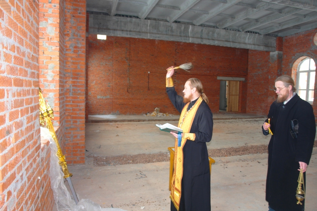 12 февраля, в день памяти Вселенских учителей, руководитель Православного центра протоиерей Сергий Поглазов освятил в помещении будущего актового зала позолоченный крест, который бригада Нижегородского ООО «Ренесанс» подняла над часовней.
