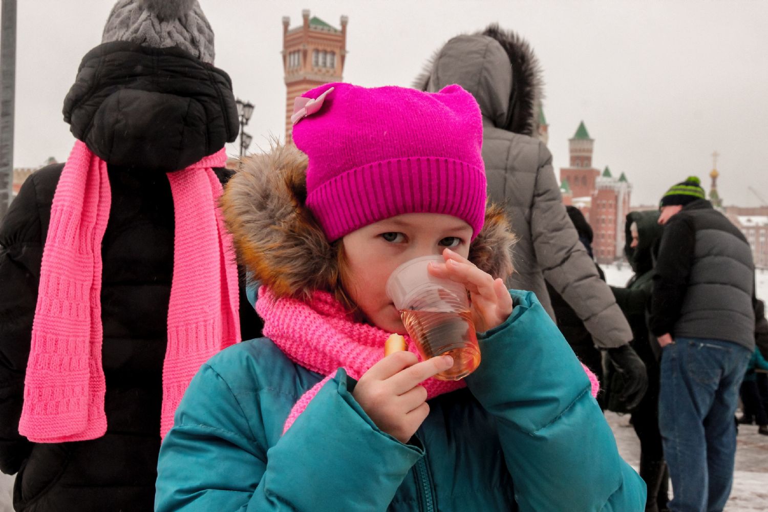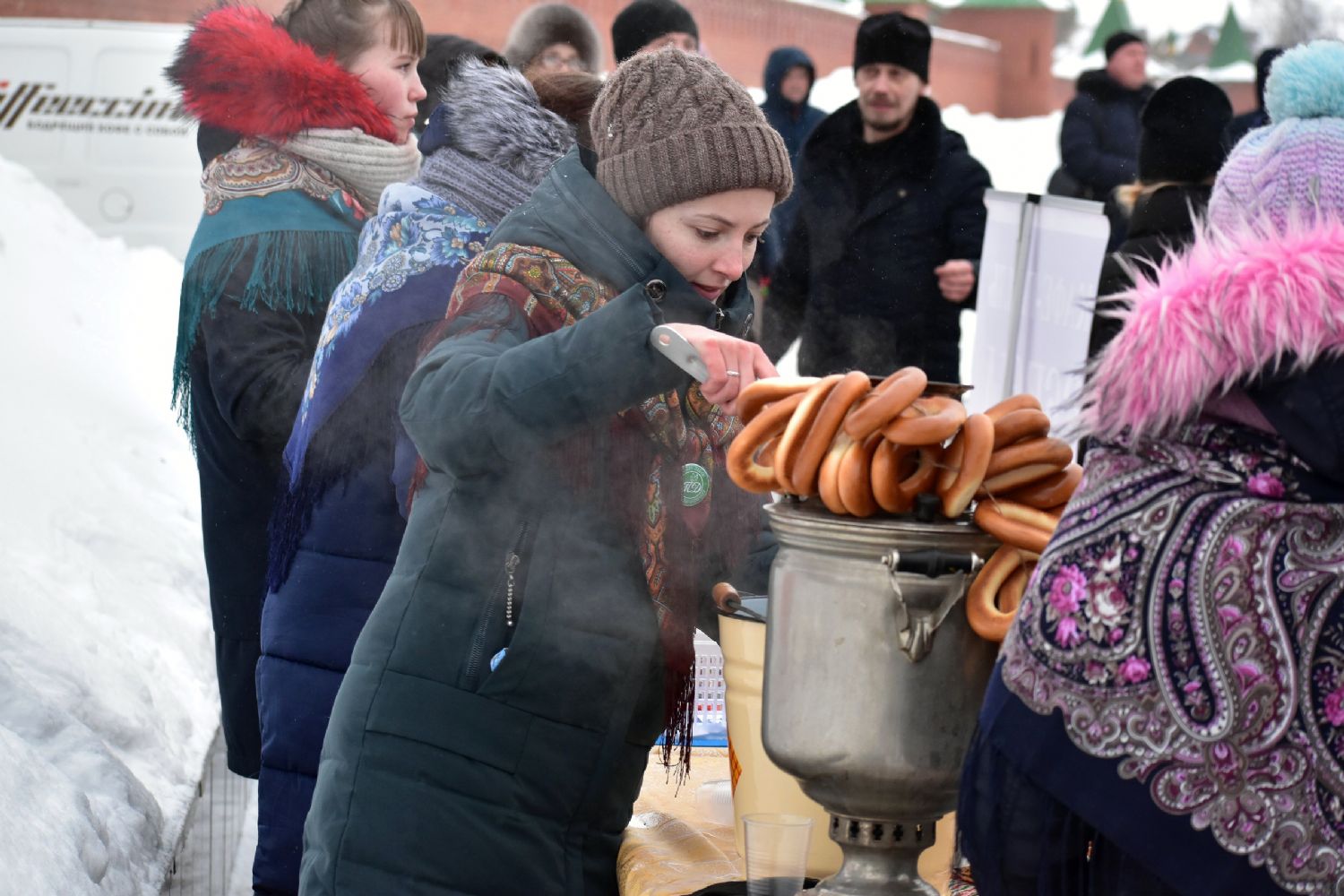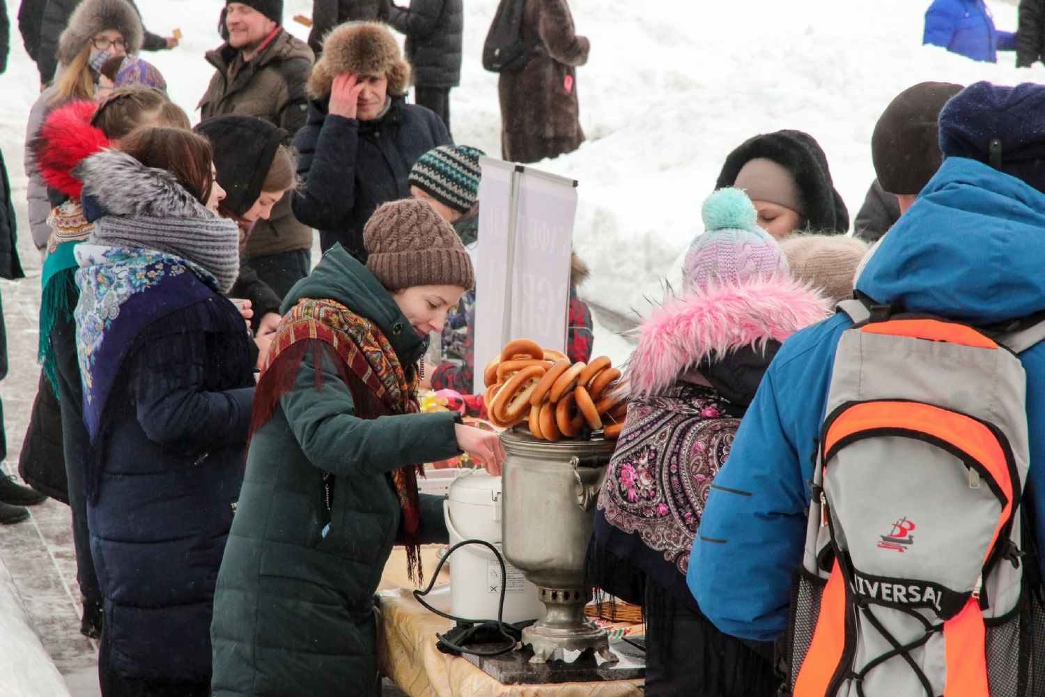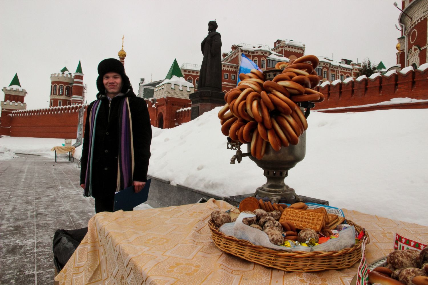 На набережной Малой Кокшаги за Воскресенским собором под открытым небом были развернуты столы с традиционным русским самоваром и баранками, на столах лежали вкусные угощения для всех пришедших на праздник. Всех желающих добровольцы поили горячим травяным чаем.
