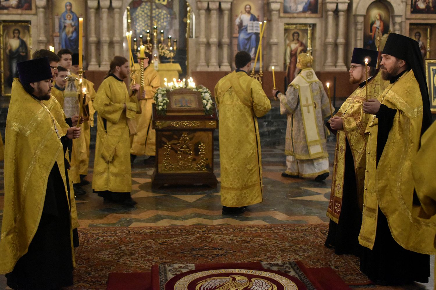 23 февраля на Всенощном бдении Владыке сослужили секретарь Йошкар-Олинского епархиального управления иеромонах Серафим (Пасанаев), клирики собора иереи Никифор Захаров, Артемий Промович, Евгений Самойлов, диаконы Андрей Дружинин, Игорь Коваль и клирик храма Рождества Пресвятой Богородицы с. Семеновка протодиакон Михаил Козловский. Песнопения исполняли младшая и старшая группы хора «Благовест».