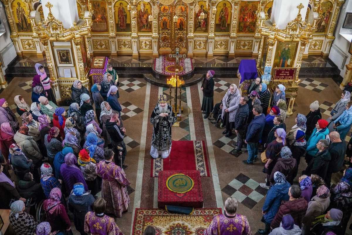 По завершении Литургии епископ Феофан поздравил духовенство и многочисленных прихожан с воскресным днем и обратился к молящимся с архиерейским словом. Владыка напомнил повествование из Евангелия о том, как фарисеи привели ко Спасителю женщину, взятую в прелюбодеянии, и стали искушать Господа Иисуса Христа. Владыка пояснил: «Они вопрошали Его: "Что повелишь, Учитель, сделать с ней? По закону Моисееву таковых подобает побивать камнями". Господь наш Иисус Христос, восклонившись, стал перстом писать на песке. И каждый, желая услышать ответ на вопрос, который они Ему задали, подходил ко Спасителю и, прочитав то, что Спаситель написал на песке, уходил смутившись, с внутренним страхом. И потом Спаситель сказал для всех вопрошающих: "Кто из вас без греха, тот пусть первый бросит в неё камень".
