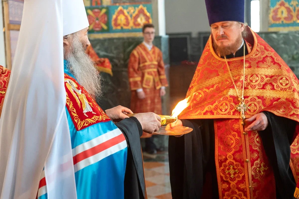 2 мая, в праздник Светлого Христова Воскресения, митрополит Йошкар-Олинский и Марийский Иоанн совершил Пасхальную великую вечерню в Благовещенском кафедральном соборе.