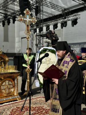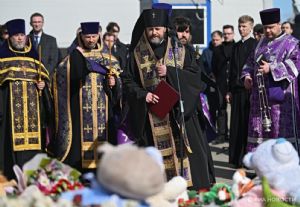 Архиерей огласил соболезнование Предстоятеля Русской Православной Церкви родным и близким погибших и возложил к мемориалу венок от Его Святейшества.