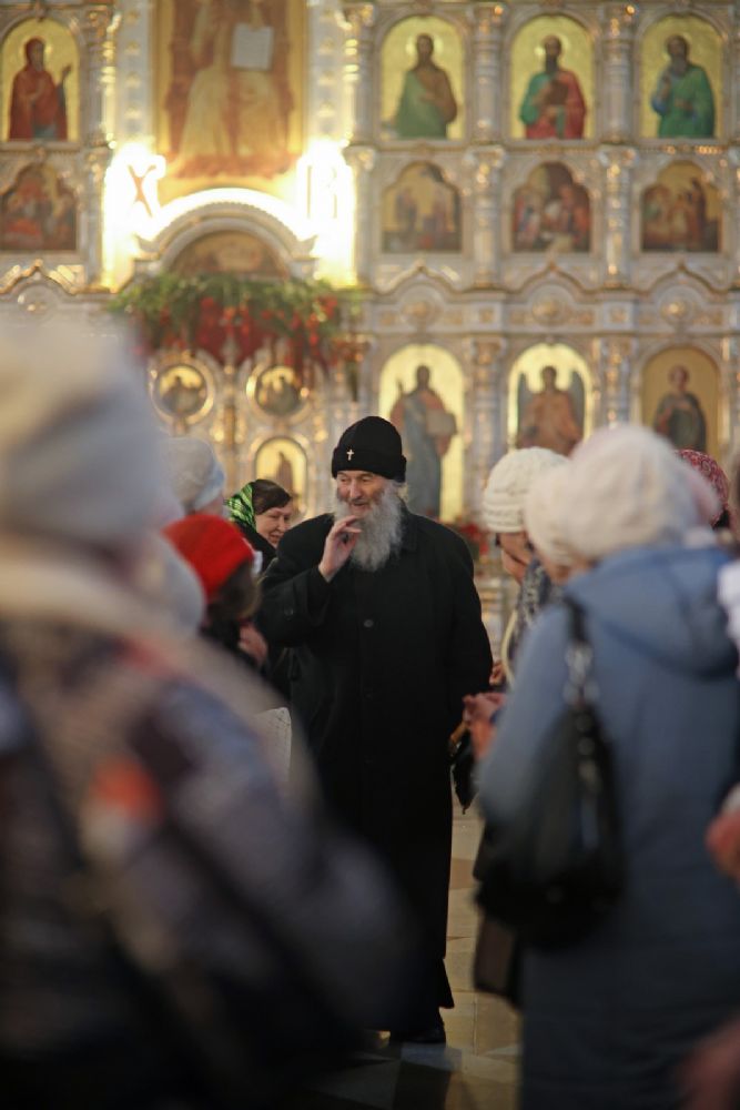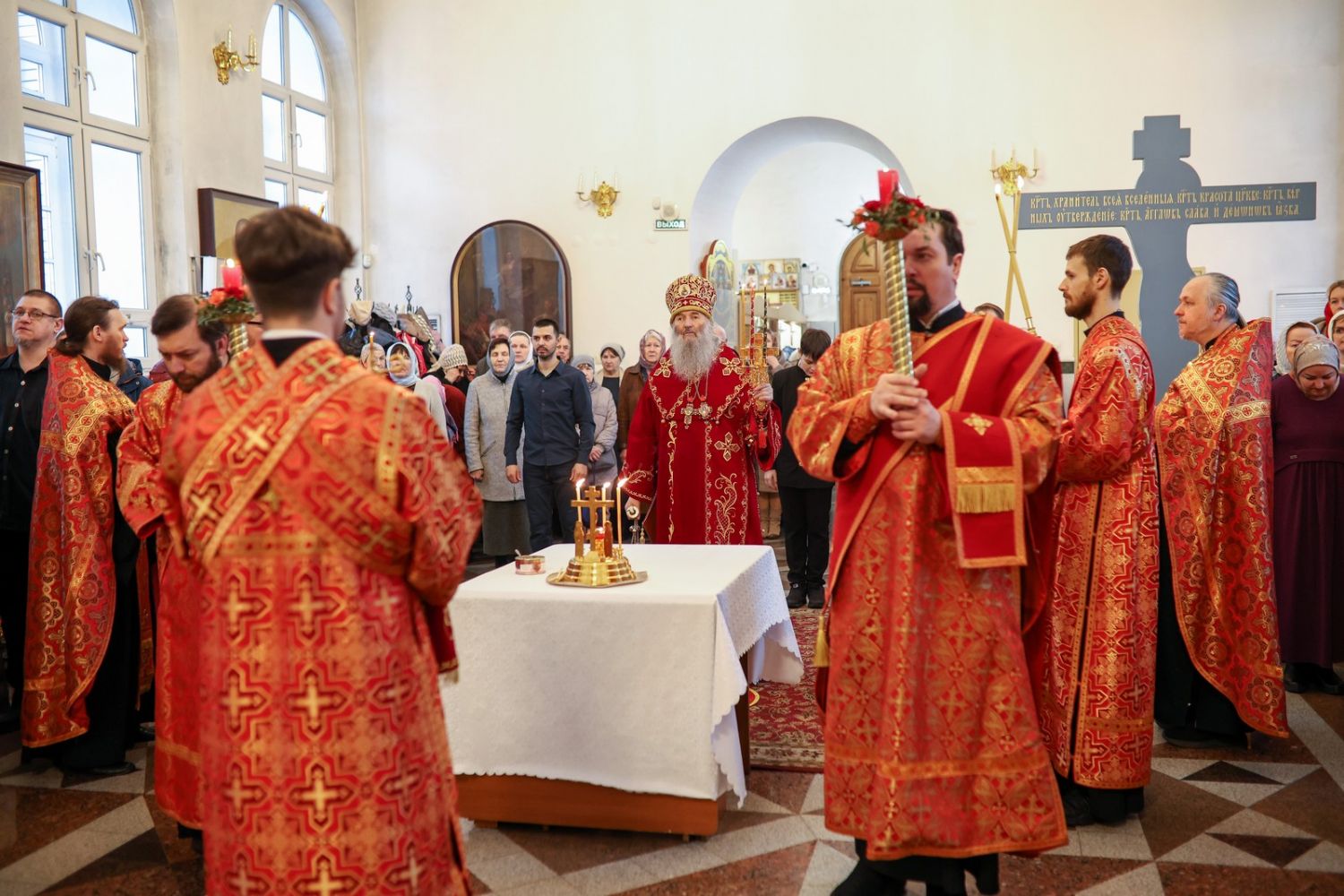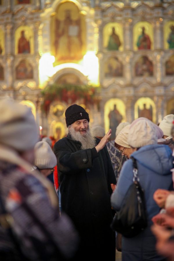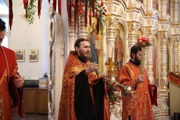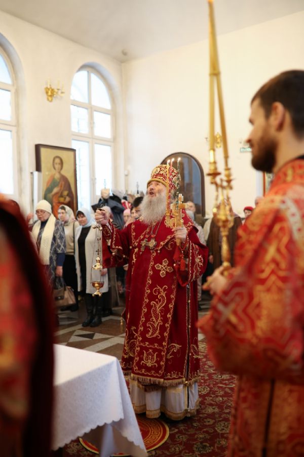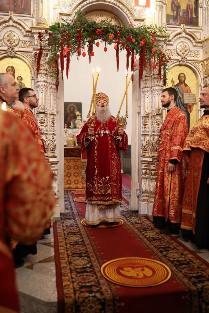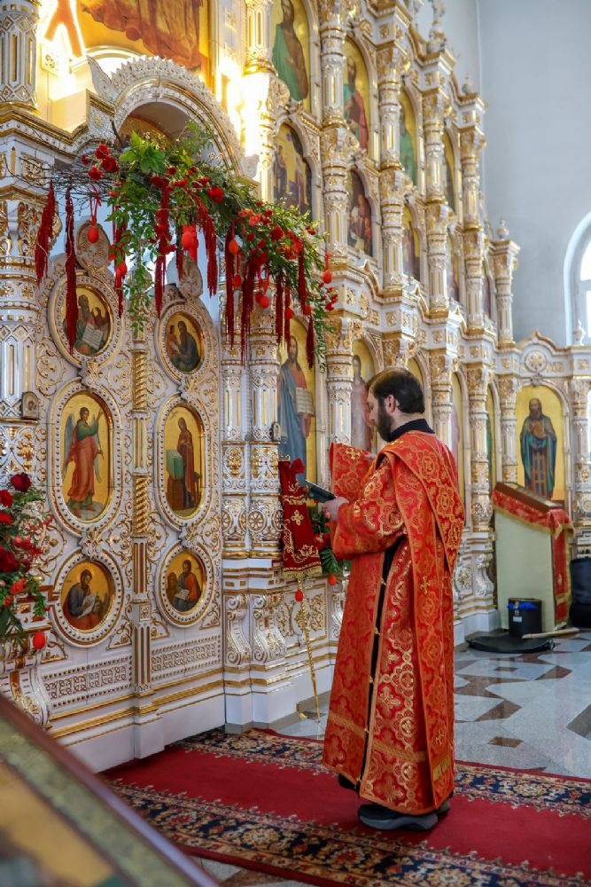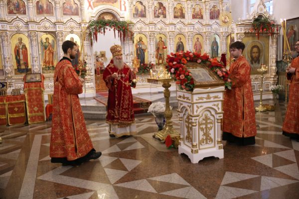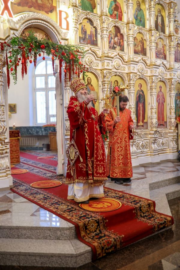 Архипастырю сослужили настоятель собора иерей Андрей Кочаков, клирики собора иерей Леонид Вылекжанин, иерей Димитрий Лукьянов и диакон Алексий Кузнецов, а также клирик Благовещенского кафедрального собора диакон Артемий Бобоч. Песнопения исполнял хор собора под управлением Алисы Вылегжаниной.