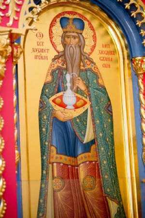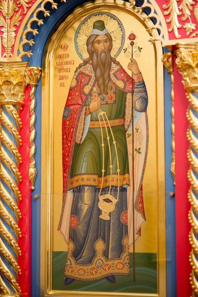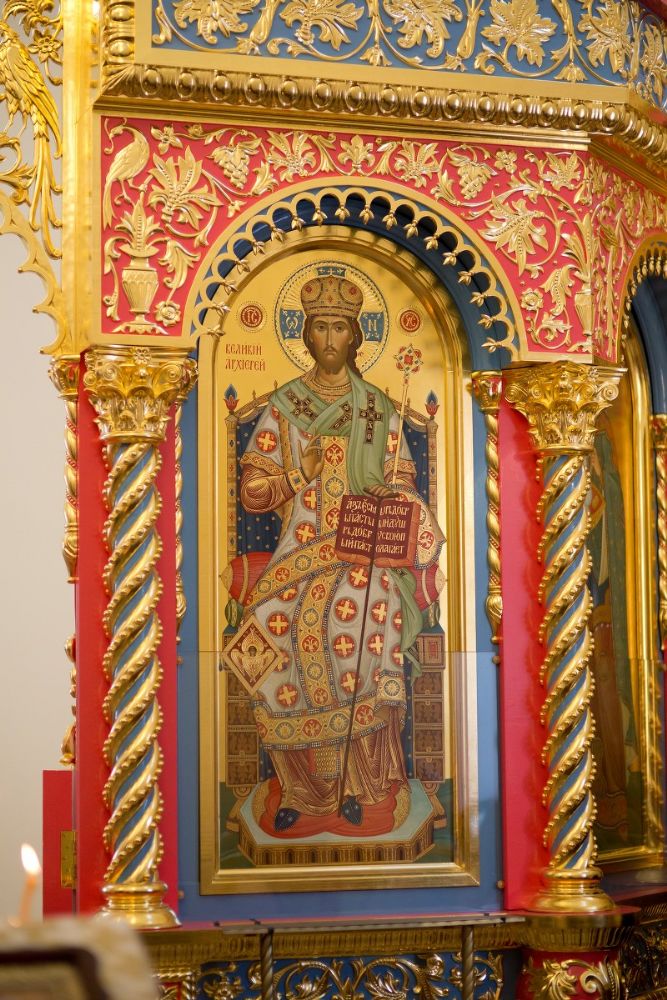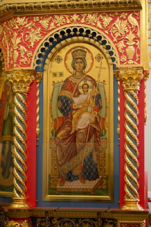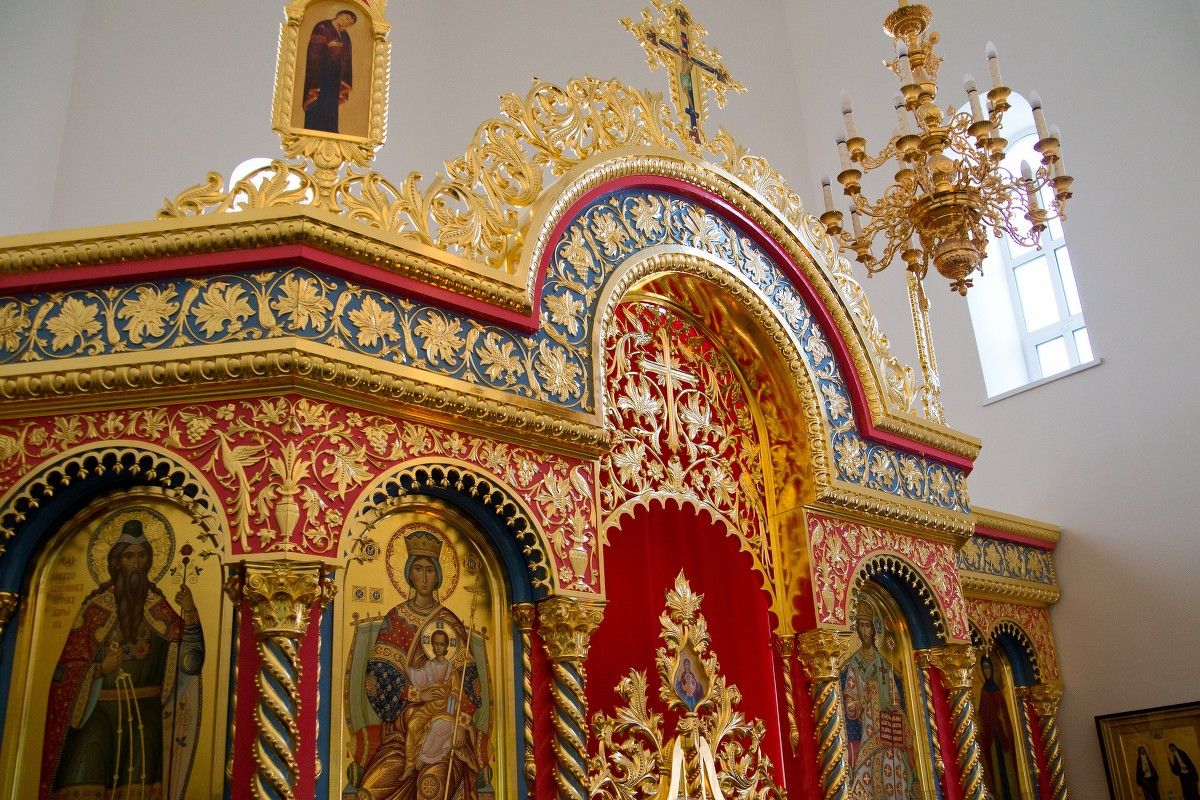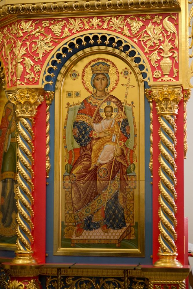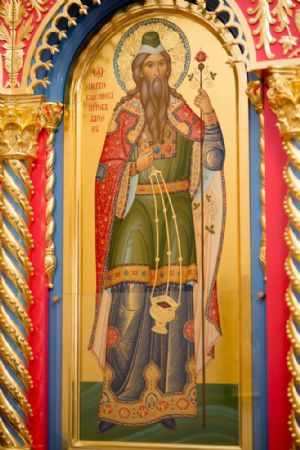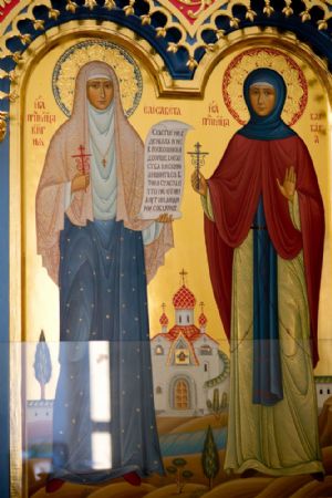 Слева от алтаря — икона святых преподобномучениц великой Княгини Елисаветы и инокини Варвары (Яковлевой) с частицами их мощей.