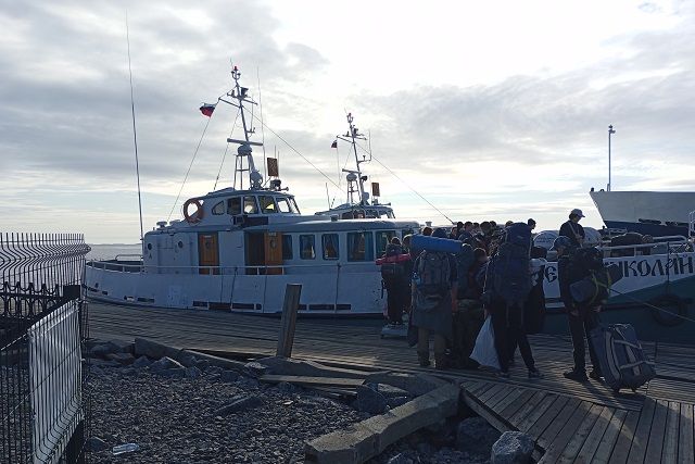 Начало седьмого часа утра. На подворье всеобщий подъем. Впрочем, неудивительно, ведь монастырские катера отходят на Соловецкие острова в семь часов, посадка же и вовсе начинается за полчаса до отправления. Чем ближе время отхода катеров, тем больше людей скапливается на причале. Они едут на Святую землю со всей страны. Так мне предстоит добираться до островов на катере «Святитель Николай» вместе с паломнической группой из Саратова. Саратовцы приехали сюда на автобусе и по дорогу уже успели посетить несколько монастырей. Вскоре наш катер успешно отшвартовался от причала и вышел в открытое море. Несмотря на солнечную и достаточно теплую погоду, заметно ощущалось влияние северного ветра. Поэтому через какое-то время все пассажиры были вынуждены покинуть открытую палубу и укрыться в кубрике.