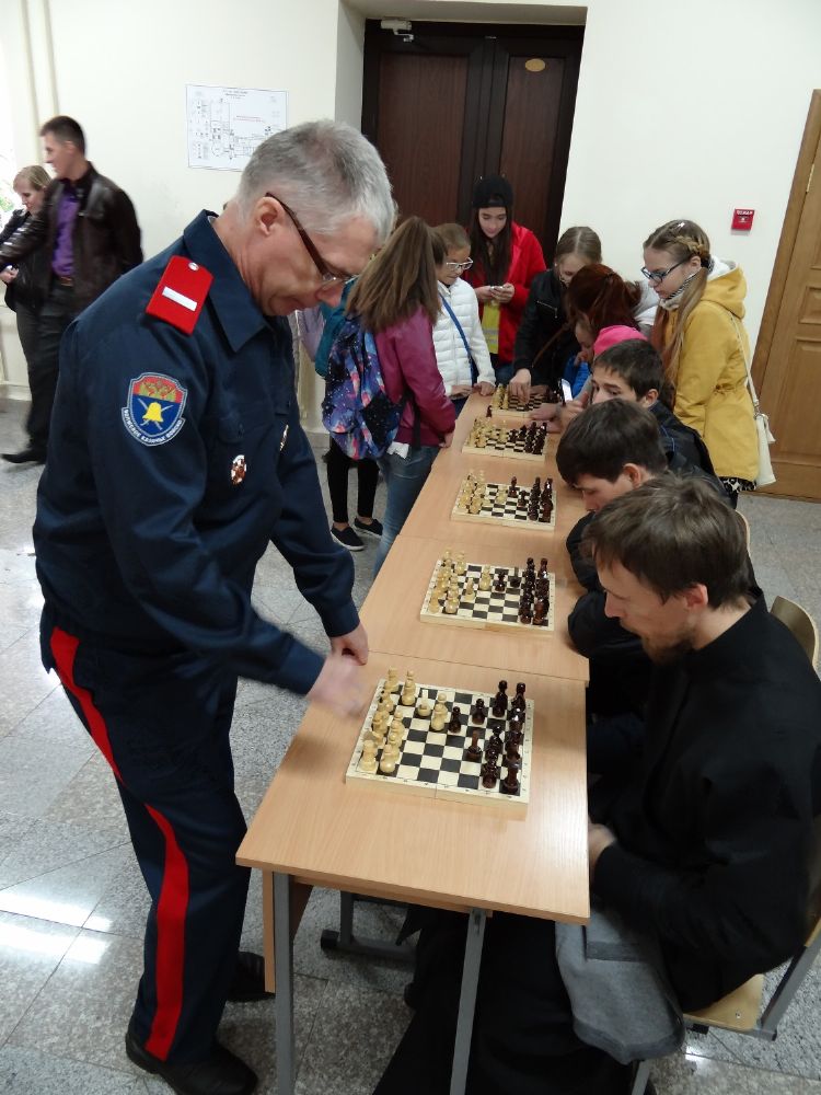 Затем в 12 часов состоялся шахматный сеанс одновременной игры на 10 досках. Провел его С. Камышников (1 разряд по шахматам). Продолжилось мероприятие играми и забавами "Православного воинства" во главе с С.Н.