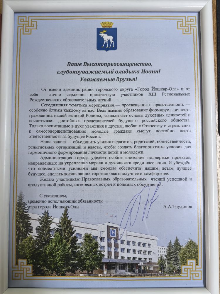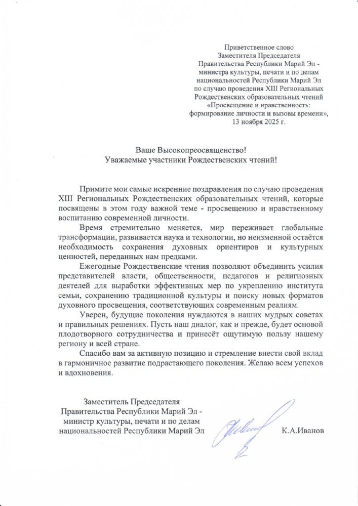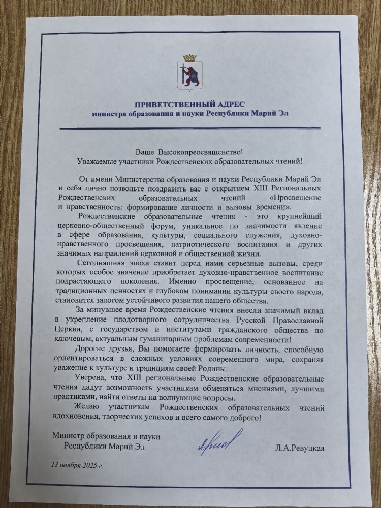 13 ноября в Православном центре г. Йошкар-Олы состоялось пленарное заседание XIII Региональных Рождественских образовательных чтений «Просвещение и нравственность: формирование личности и вызовы времени».