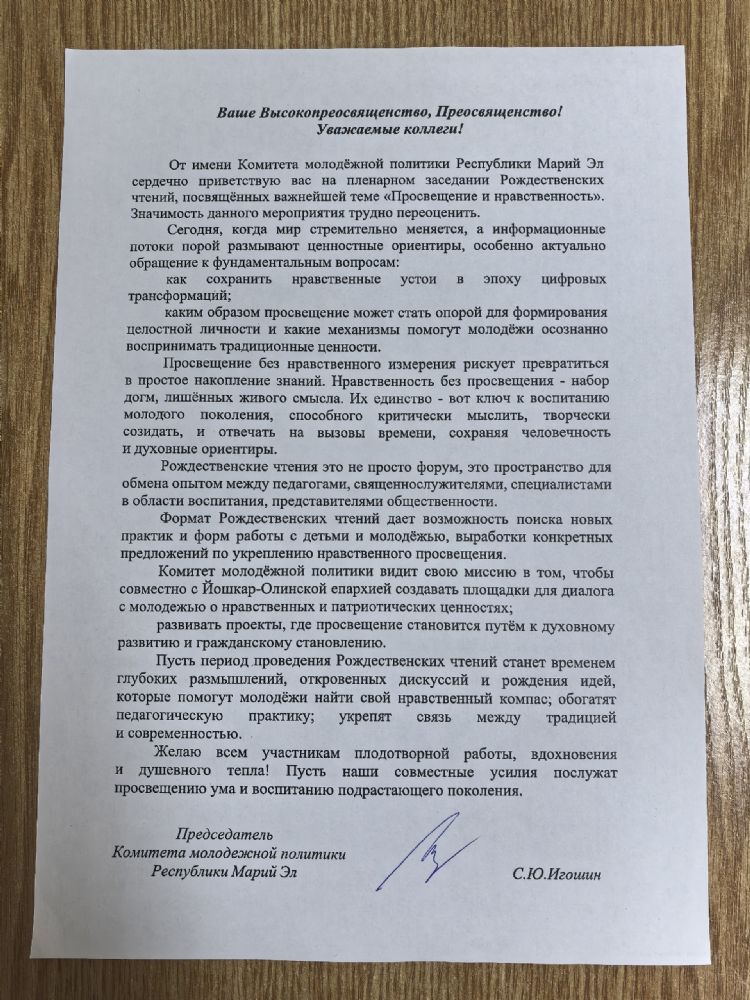 Епископ Волжский и Сернурский Феофан, обращаясь к собравшимся, отметил, что для образования человека недостаточно лишь преподавания земных наук без духовной основы. По словам святителя Феофана Затворника, уже в XIX молодые люди, которые получали знания во многих образовательных учреждениях, практически не имея при этом никакого духовного фундамента, были в духовном смысле похожи на человечков с огромной головой, крохотным телом и микроскопическими ножками. И в молодежной среде зачастую царило вольнодумство, которое привело в конце концов страну к печальным последствиям…