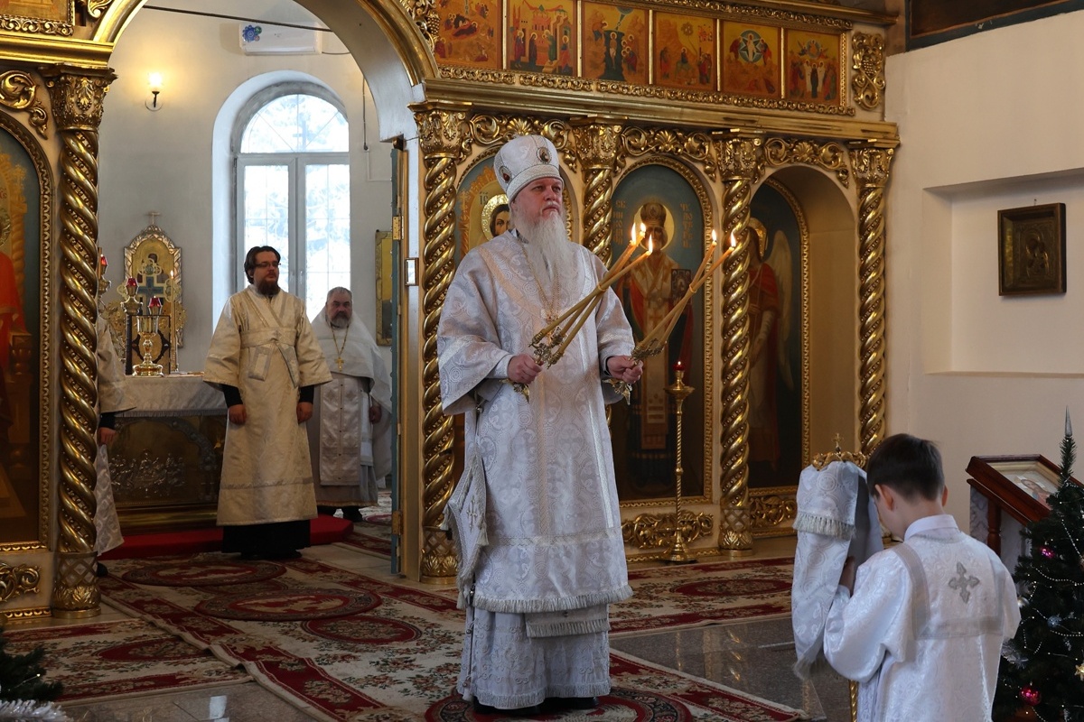21 января епископ Волжский и Сернурский Феофан совершил Божественную литургию, а накануне вечером – всенощное бдение в Никольском кафедральном соборе г. Волжска.